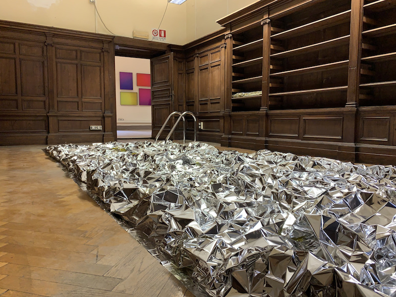 Nei dipinti di Marco Angelini, le forme che si diffondono liberamente sulla tela creano composizioni pittoriche specifiche. Le forme geometriche dai colori intensi introducono contrasto e si fondono con elementi fluidi e ibridi che creano l’impressione di movimento. [...] Andrea Pinchi, invece, realizza quadri dominati da arrangiamenti geometrici e colori tenui: [...] sottili linee di spago collegano singole parole, immagini, idee, creando un sistema di pensieri, ricordi e parole. Federica Zianni reinterpreta elementi culturali e antichi miti, dando loro una prospettiva nuova, appena colta. [...] L’artista permette alle sculture di assumere forme libere che danno l’impressione di movimento e si modellano per così dire dinanzi gli occhi dello spettatore. [...] EPVS presenta un’opera realizzata appositamente per l’occasione, intitolata Saves, che è una sorta di omaggio alle precedenti versioni dell’installazione The Pool: [...] la piscina è un contenitore geometrico di emozioni e storie, mostra l’invisibile ed è accompagnata da un brano musicale di Sebastian Vimercati, che fa riferimento al parallelo tra lo spazio chiuso di The Pool e le difficoltà incontrate dall’umanità in questo momento.” (dal testo critico di Paulina Grubiak)