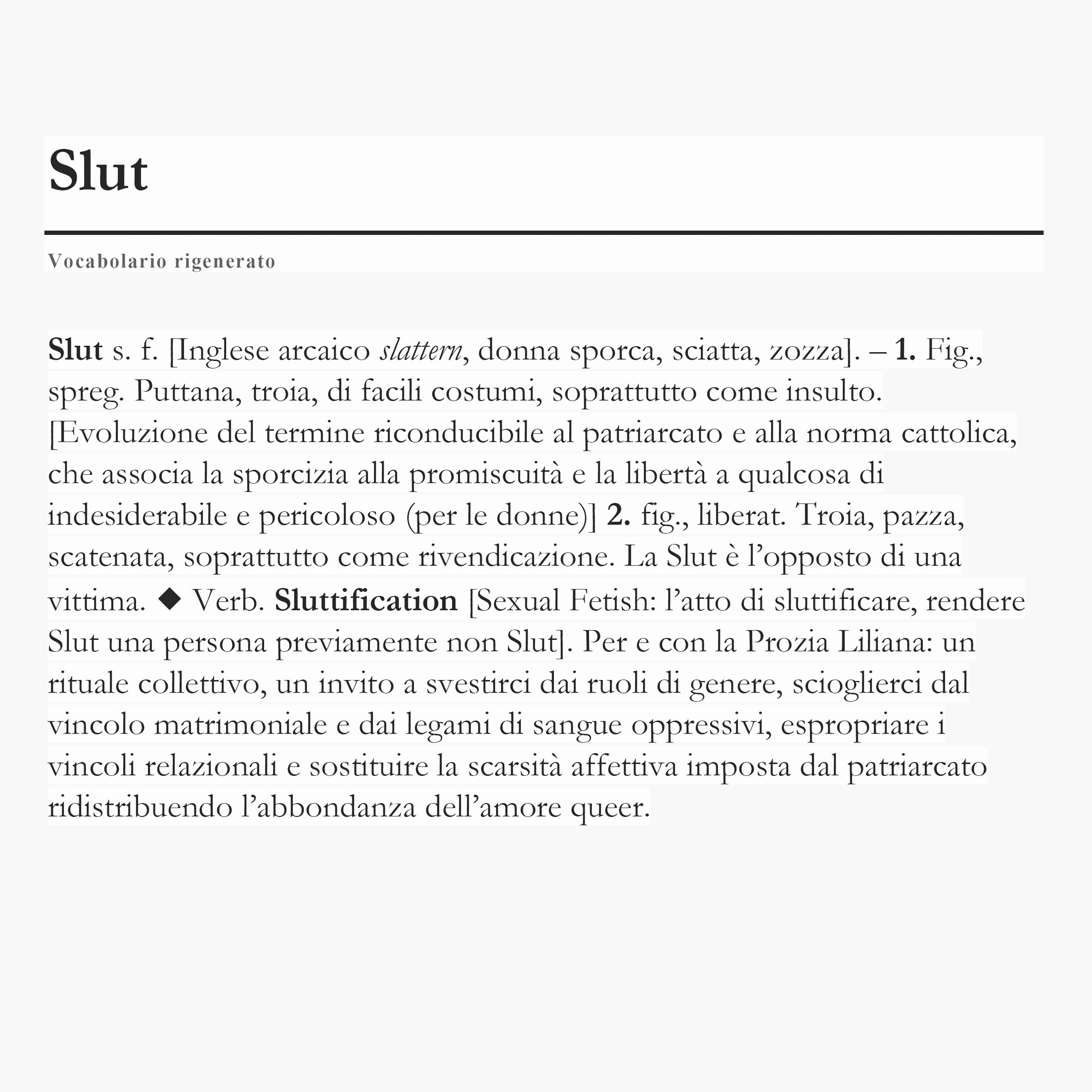 Sluttification: È un rituale attraverso cui restituire alla prozia la libertà e il piacere di autodeterminarsi che le sono stati negati. Non più zitella ma donna libera, una pazza scatenata che riscopre l’eros, la forza vitale che le è stata sottratta in vita. (per approfondire si veda Sluttification.pdf in cartella stampa)