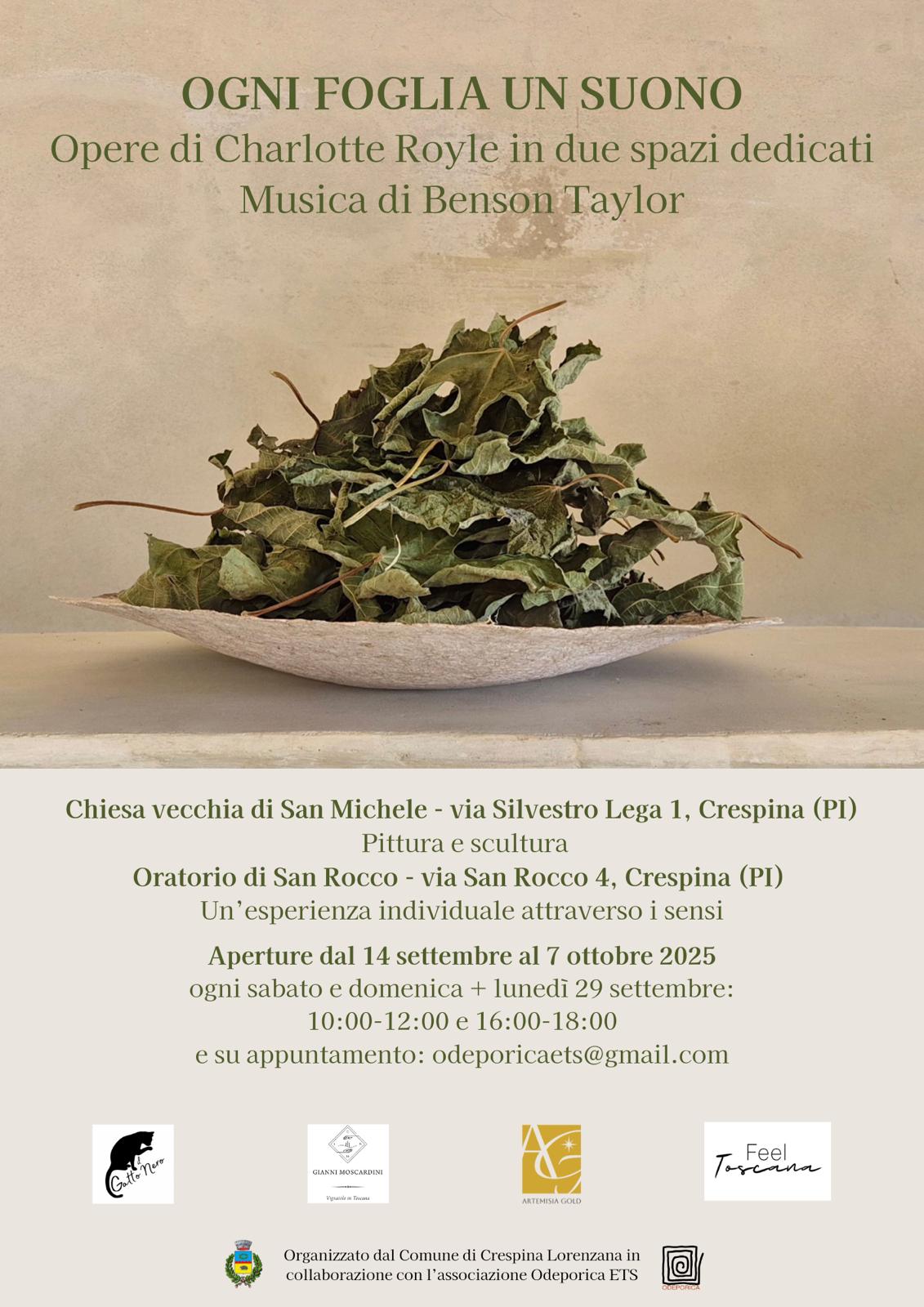 Ogni Foglia un Suono è una collaborazione con l’Associazione Odeporica e porta il lavoro di Royle fuori dallo studio, in due luoghi unici a Crespina: l’Oratorio di San Rocco e la Chiesa del vecchio San Michele. La piccola chiesa di San Rocco offrirà un’esperienza intima e multisensoriale, inclusa musica originale composta da Benson Taylor, mentre nella Cappella della Madonna del Rosario a San Michele saranno esposti i dipinti realizzati in dialogo con gli spazi interni ed esterni, caratteristici dell’antica chiesa.