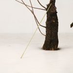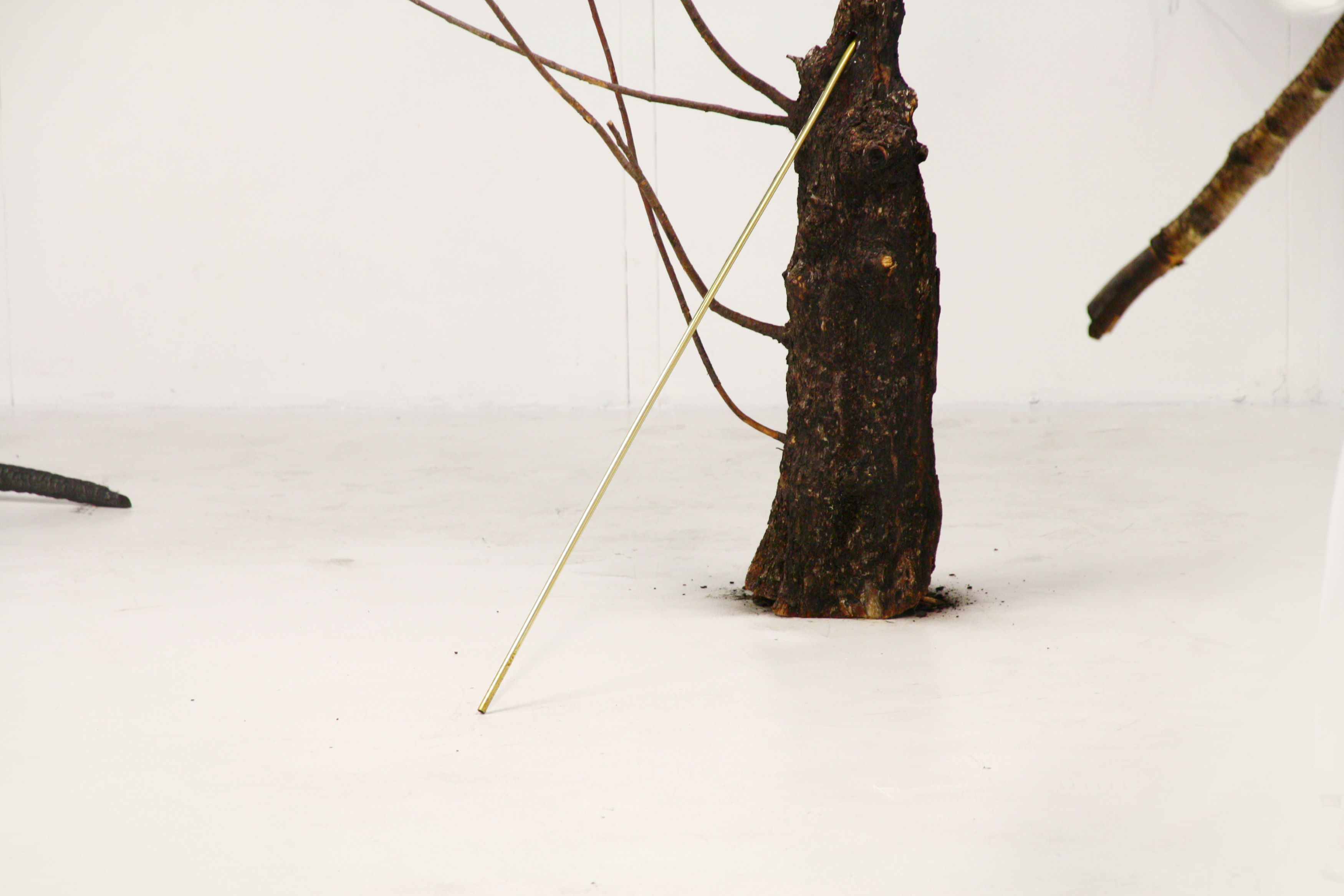 Se nell’intervento milanese i resti di tronchi bruciati occupavano lo spazio disposti senza vita sul pavimento o in sospensione evidenziando alcune protesi in ottone, a Lecce il box di Kunstschau si trasforma in un nuovo sepolcreto, dove gli alberi inceneriti appaiono ormai ridotti in segatura e cenere, a suggerire un atto di caduta ed elevazione, catarsi di un corpo carbonizzato, perenne ricordo di una solidità perduta, estrema dissoluzione della originaria forma e funzione.