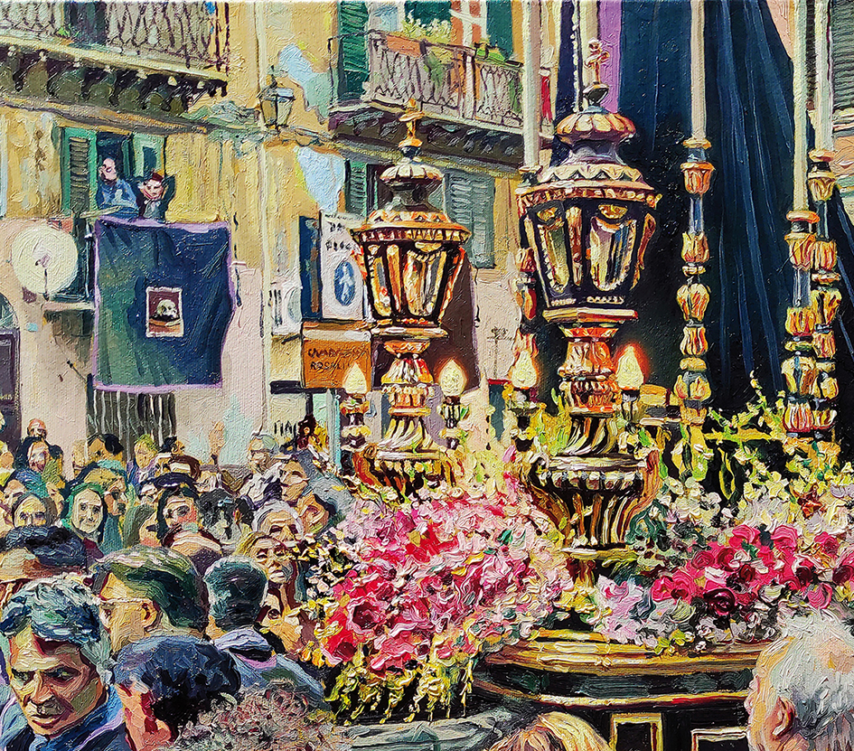 In questa mostra Palermo si trasforma in un teatro di narrazioni non delimitate da confini geografici, ma estese verso una dimensione più ampia e globale, rappresentando, in piccolo, ciò che accade a qualsiasi latitudine. Le storie personali e collettive che qui prendono vita intrecciano un tessuto ricco di significati e simboli, offrendo uno spaccato delle dinamiche umane che trascendono le limitazioni territoriali. In tale contesto, possiamo intendere le opere esposte come preghiere visive o, meglio, ex voto di speranza, non per desideri o bisogni egoistici, ma per aspirazioni e necessità condivise. Santa Rosalia, patrona della città, diventa un simbolo tangibile di questa speranza e di questa ricerca, un punto di riferimento spirituale per coloro che si affidano alla sua intercessione in momenti di difficoltà.