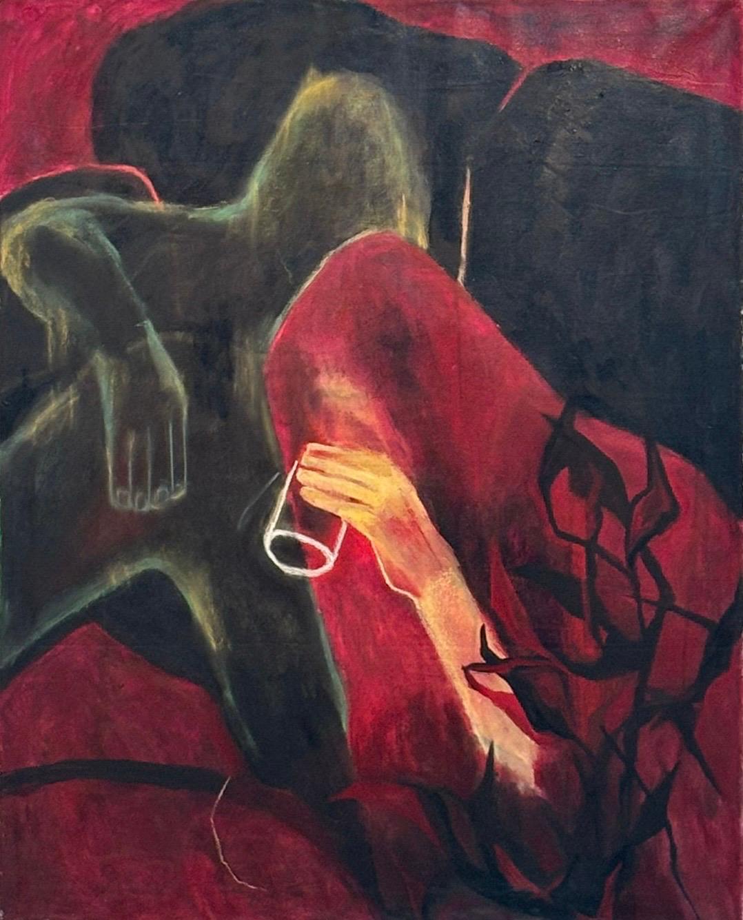 Le opere, caratterizzate da una pittura materica e da cromie accese – tra cui il rosso tradizionalmente indossato dalla sposa cinese – mettono in luce la distanza tra la rappresentazione sociale della festa e la dimensione interiore dei suoi protagonisti. Il banchetto diventa così un dispositivo narrativo che interroga la presenza dell’Altro, la fragilità dell’unione e il vuoto che spesso si cela dietro i rituali collettivi.