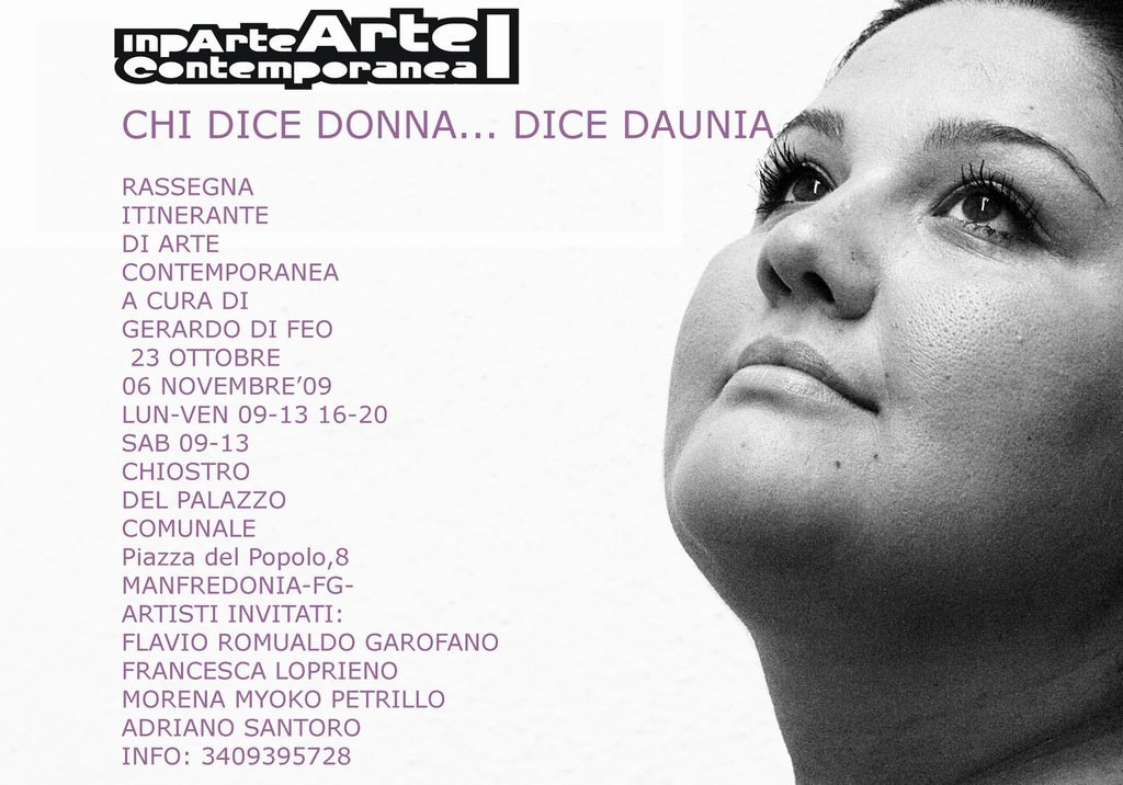 “Chi dice donna… dice Daunia” è una rassegna di opere d’arte contemporanea che parla del mondo femminile in relazione ad un territorio italiano: la Daunia, territorio che può essere individuato con l’attuale provincia di Foggia. Gli artisti invitati sono tutti trentenni con esperienze artistiche solide che spaziano dal teatro al cinema, dalla fotografia al disegno.