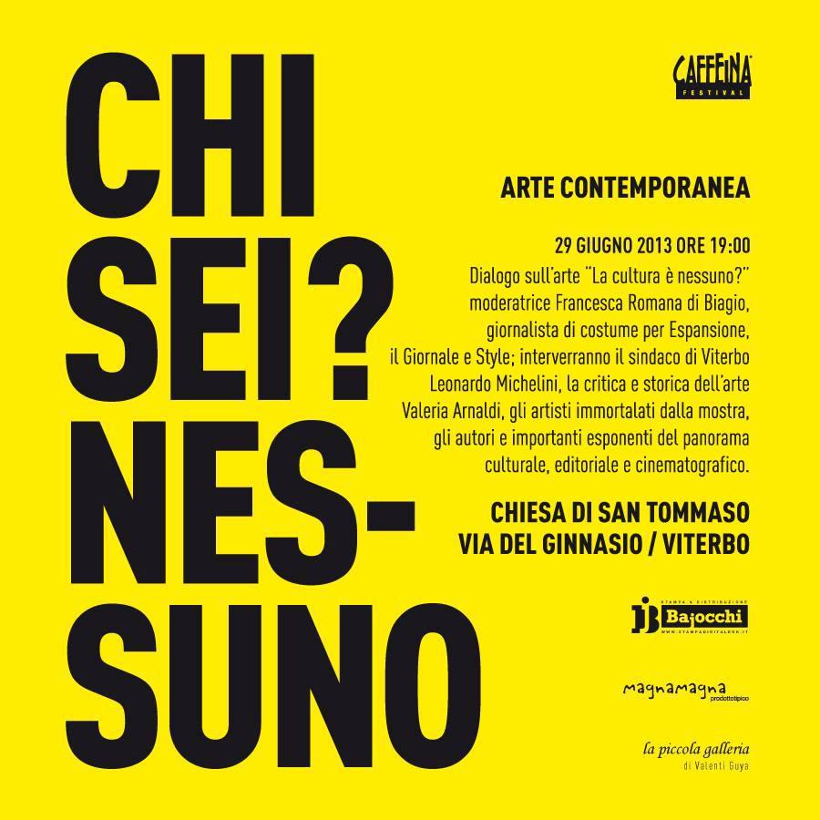 Vernissage sabato 29 giugno alle ore 18,00. Seguirà alle ore 19,00 un dialogo sull’arte “La cultura è nessuno?” moderatrice Francesca Romana di Biagio, giornalista di costume per Espansione, il Giornale e Style; interverranno il sindaco di Viterbo Leonardo Michelini, la critica e storica dell’arte Valeria Arnaldi, gli artisti immortalati dalla mostra, gli autori e importanti esponenti del panorama culturale, editoriale e cinematografico.