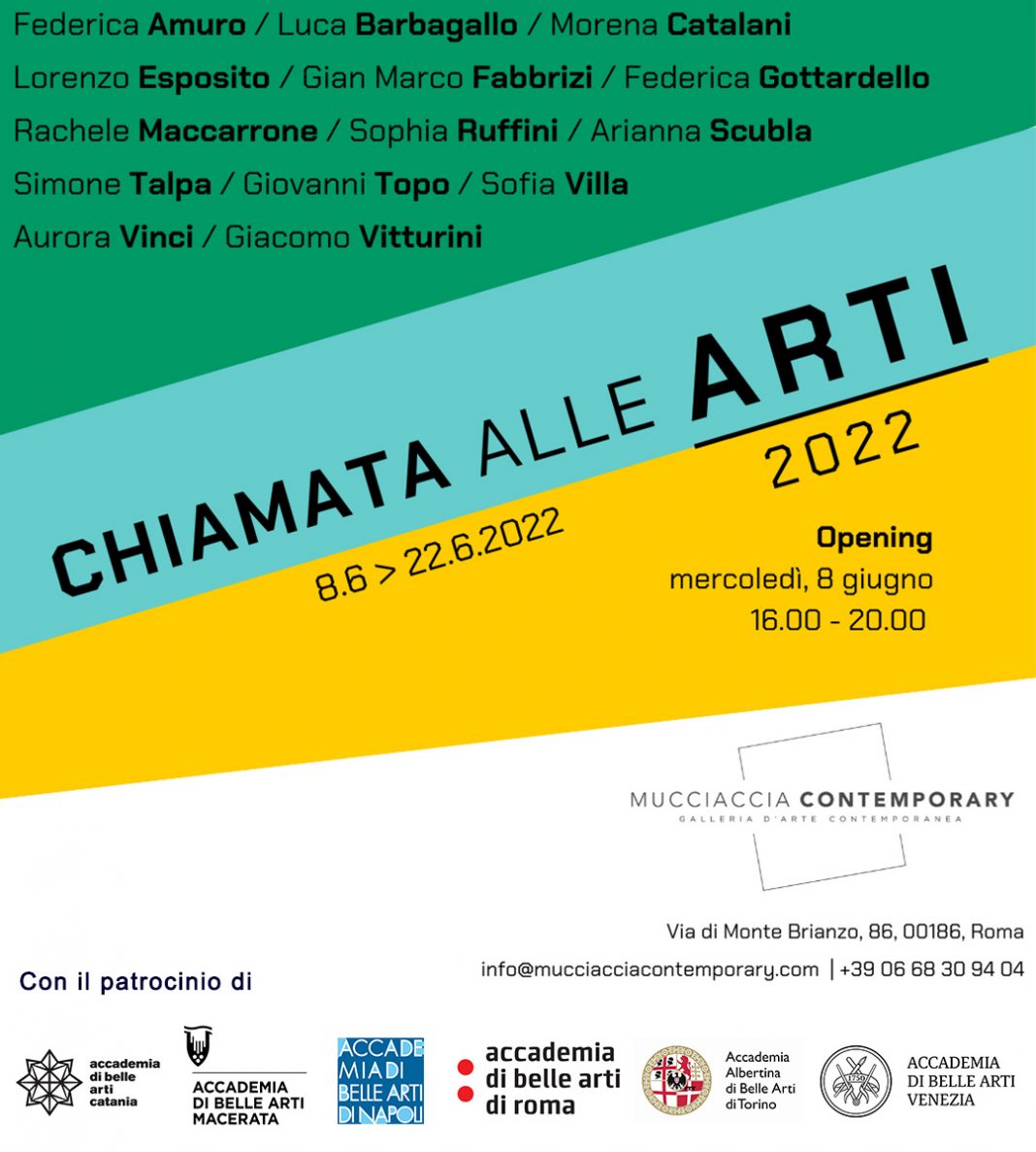 Mucciaccia Contemporary è lieta di presentare la mostra collettiva Chiamata alle Arti | 2022 nata a seguito del progetto lanciato nel 2021 che ha inteso dare sostegno alle Accademie di Belle Arti sparse su tutto il territorio nazionale e visibilità agli studenti ed alla loro creatività artistica.