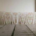 Il progetto vincitore del PAC2022-2023, pensato da Chiara Camoni per Fermo, si ricollega alle esperienze di lavoro condiviso che caratterizzano il modo di operare dell’artista ed è partito dall’idea di esplorare, con diversi gruppi di persone, dei luoghi simbolo del crearsi ed esistere della comunità cittadina ovvero le antiche fonti extra urbane di Fermo. Durante un periodo di residenza che l’artista ha svolto in città, sono state organizzate delle passeggiate che hanno coinvolto studenti di tutte le età, appassionati e curiosi. In tali occasioni sono stati effettuati dei prelievi nel paesaggio utili a dare forma, attraverso una pratica condivisa, all’opera finale. Questa è un intervento installativo che ha trovato spazio nella Sala Boscoli della Pinacoteca civica. È composto da una scultura ovvero una struttura in ottone che ospita dei teli di seta ‘disegnati’ da erbe e fiori incontrati e raccolti durante le passeggiate. Non erbe tintoree ma erbe trovate, “erbacce”: tutte quelle che segnano il cammino e che invadono tutti i paesaggi che sono stati attraversati. Con queste è stata fatta una stampa diretta su seta che ha lasciato emergere “gli spiritelli” delle piante stesse e dei luoghi. L’installazione comprende anche un video legato a queste azioni condivise. Il progetto ha richiamato anche la pratica di “pittura a succhi d’erbe” tipica di questa area delle Marche, utilizzata per quadri e carte da parati fino al XVIII secolo.