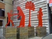 Collocata sulla balconata esterna del Museo, affacciata su via dei Baullari, l’opera, di grande suggestione e di notevole impatto visivo, presenta una serie di sagome in lamiera metallica dipinta di rosso, saldamente ancorate a terra, alte circa 3 metri, che riproducono le figure rappresentate nel rilievo.