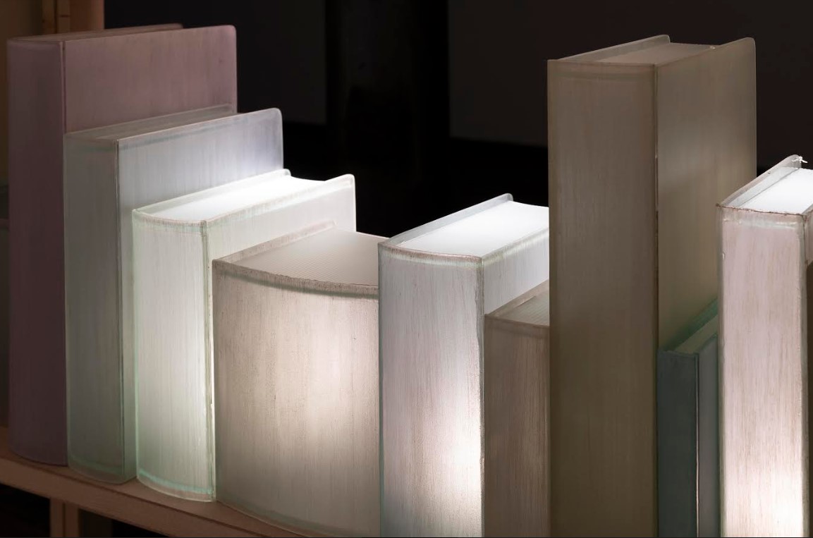 Una libreria bianca contiene alcuni libri in vetro, sabbiati e dipinti a mano con diverse tonalità di bianco. Lo spazio incolore della vetrina, nel quale paiono scomparire gli elementi che lo popolano, si accende direttamente tramite i libri, singolarmente illuminati dall’interno, che rappresentano semanticamente la luce della conoscenza.