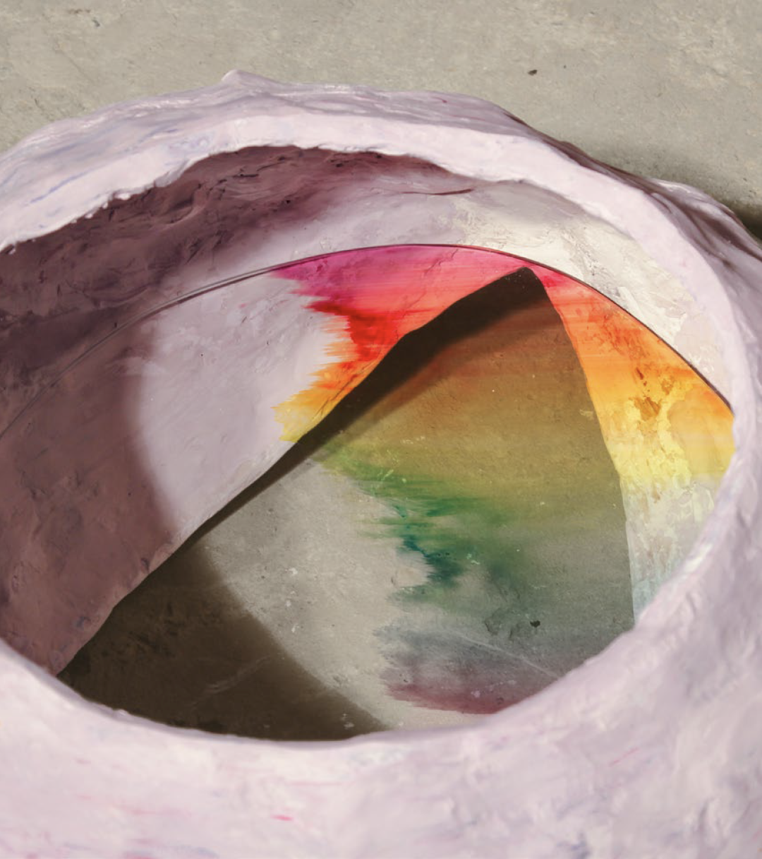 Per questa mostra, l’invito che l’artista fa allo spettatore è ad entrare e a godersi la dimensione quieta e ignota che si nasconde sotto i nostri piedi. All’ingresso dello spazio espositivo, la prima opera visibile è un pendolo, che indica una direzione obliqua di tensione verso il basso; una serie di opere su carta rappresentano una ramificazione sotterranea che cambia il proprio significato a seconda del colore che riempie il vuoto. Infine, le tavolette in gesso sulle quali appaiono ibridi metamorfici e animali alati esprimono la capacità di vivere quella condizione di sospensione a lungo ricercata dall’artista. L’esposizione racconta una mutazione continua in cui nulla è uguale a sé stesso. Se come afferma la Gambirasio, la dimensione del vuoto è unica e necessaria affinché la vita si possa manifestare […]; risiedere nel vuoto significa sospendere il tempo e sorvolare le cose.