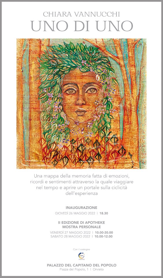 Dal 26 al 28 maggio a Orvieto, presso il Palazzo del Capitano del Popolo, la II Edizione di “Apotheke” ospita la mostra personale “Uno di Uno” di Chiara Vannucchi. La pittura è lo strumento che più ci avvicina alla prima dimensione di coscienza, all’Uno. Dimensione deriva dal latino di - due e mentio - misura, la misura di due punti, ovvero il punto di riferimento dell’osservatore verso l’osservato. Uno di