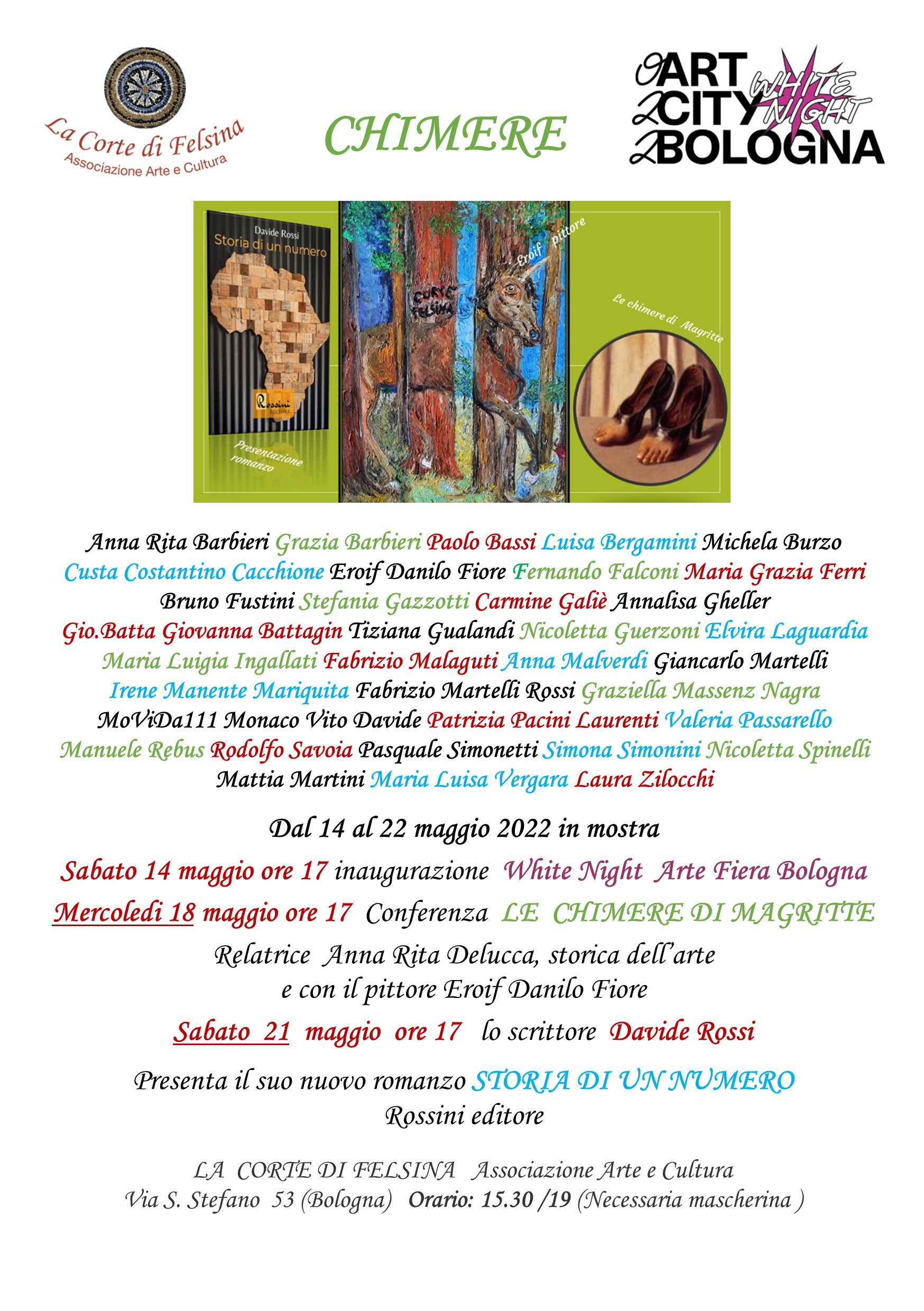 In questa esposizione di dipinti, grafica fotografia, scultura, digital art, gli artisti interpretano ed esprimono attraverso la loro libera creatività il tema della chimera ,ossia l’effimero l’illusorio, il sogno e la realtà.