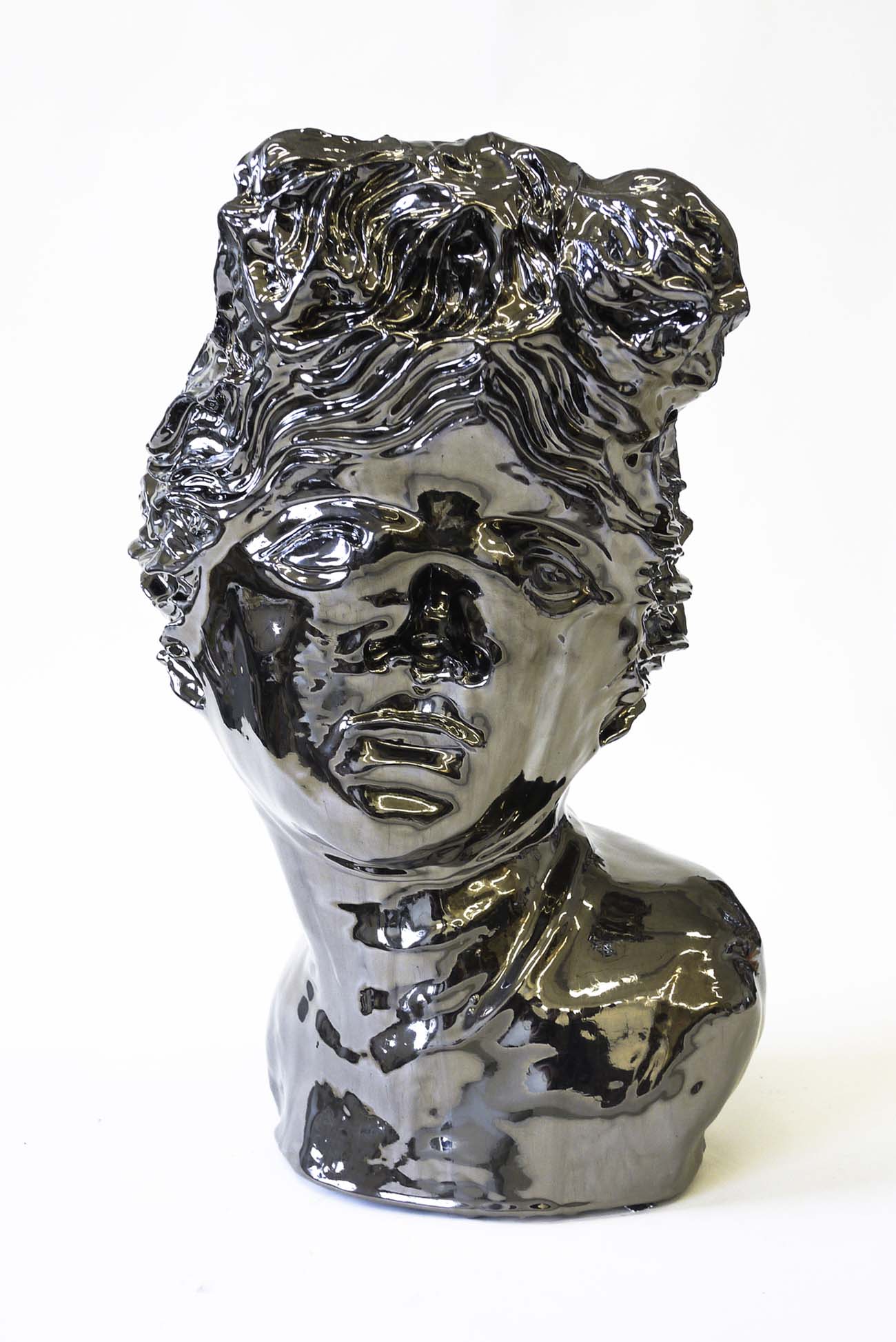 Per realizzare le sculture in ceramica smaltata dall’effetto specchiante presenti in mostra, l’artista si serve di modelli provenienti dalla tradizione della ritrattistica classica. I busti di queste figure storiche scolpite nel marmo e a noi molto familiari, vengono catturate da Gonzenbach attraverso un calco in silicone che, una volta rovesciato su se stesso, diventa la matrice per un nuovo volto dai tratti inediti. I caratteri distintivi di Omero, Platone, Apollo o Caracalla, vengono così mostrati da un punto di vista inusuale, i nasi appaiono scavati così come le orecchie e i capelli, tutte le fattezze dei personaggi esposti subiscono un ribaltamento e l’idea del busto, come simbolo di potere, forza e bellezza immutabile viene messa in discussione. I canoni estetici convenzionali vengono letteralmente rovesciati e i ritratti assumono una nuova identità.