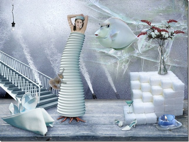 Un ghepardo addormentato in una vecchia cucina dai muri scrostati, un cancello gotico soffocato di rampicanti che delimita un pezzo di mare; giganteschi animali acquatici che abitano vecchi appartamenti bohémien e principesse vestite di corolle di fiori solo appena appassiti. L’immaginario di Christiane Draffehn è fervido e carnale, gremito di simbolismi a volte riconoscibili a volte noti solo all’artista. Nelle sue scene lunari, stranianti, abitate da creature impossibili – ibridi tra umani e animali o tra animali e piante – è facile leggere sottotraccia la lezione di Dalì. Ma è una suggestione che l’artista stempera subito nella pacata serenità di una composizione ordinatissima, elegante, pulita, non lontana per certi versi dalle atmosfere patinate della fotografia di moda. A volte, paradossalmente, Draffehn si rivela addirittura minimalista: un’architettura squadrata, un uccello dal corpo di foglia, una fanciulla sdraiata con un anemone al posto del viso, una scala, un paesaggio nuvoloso in lontananza. E poi c’è la scelta, tutta emotiva, di un colore dominante: verde acido, bianco lattiginoso, viola carico e pesante. Perché Draffehn sa bene che, proprio come la musica, il colore detiene il potere dell’immediatezza. E la comunicazione arriva forte e chiara dall’occhio al cuore.
