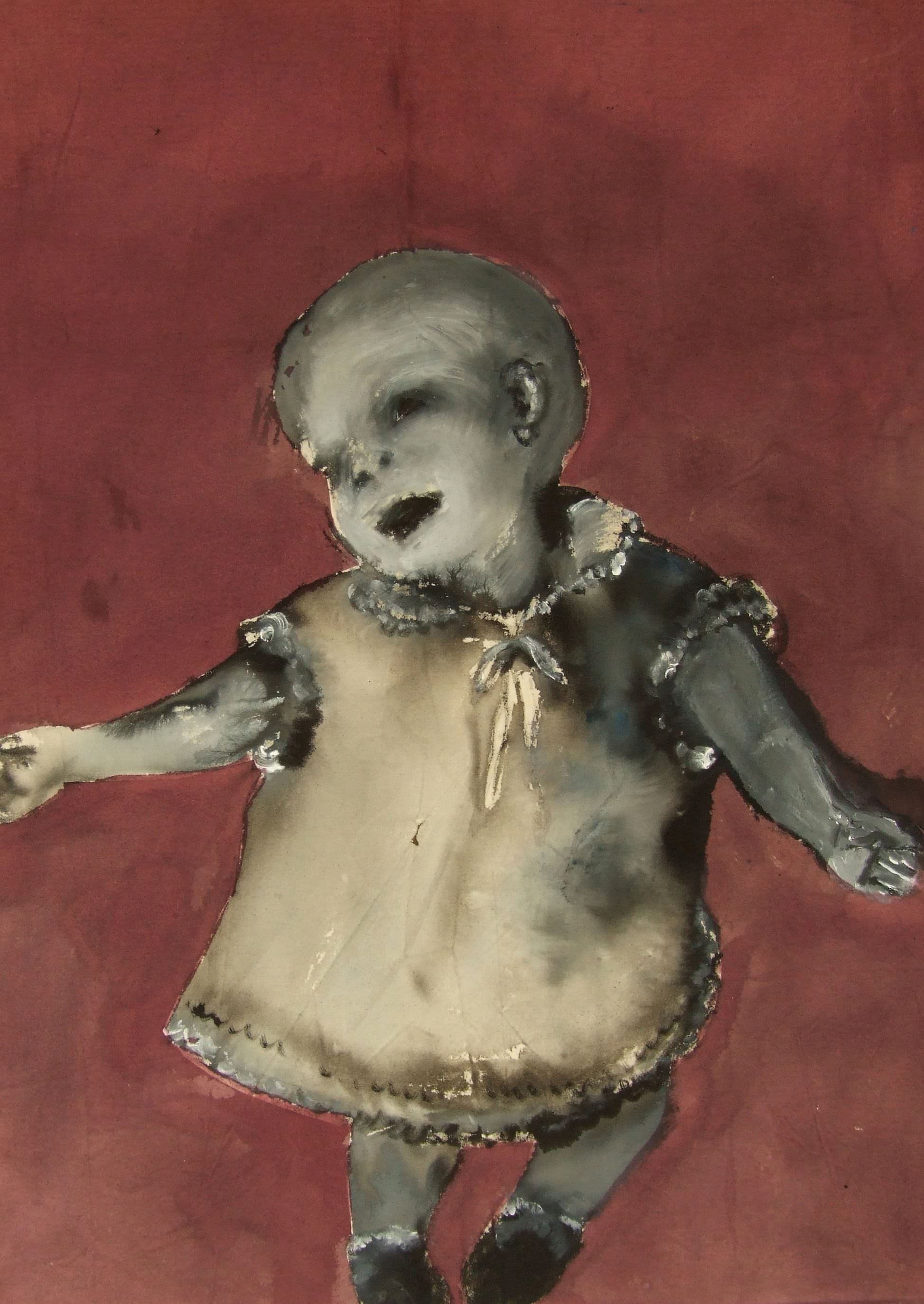 Armless mannequins, men in dresses, boys with guns, screaming babies, goats and hanging dolls... these are things which jump out and ask to be studied more closely. Here, in Postmen in East Hull the element of chance, together with a loose handling of paint, contributes an ethereality, which alongside the materiality of the work, returns the viewer to the reality of it being a painting, something made, something ultimately incapable of transcending the historical gap between now and the past. The postmen are forgotten, the letters they delivered rest, in large, in the soil with them. The artist is left with no option but to set to work again. A perpetual physical involvement leaving new traces.