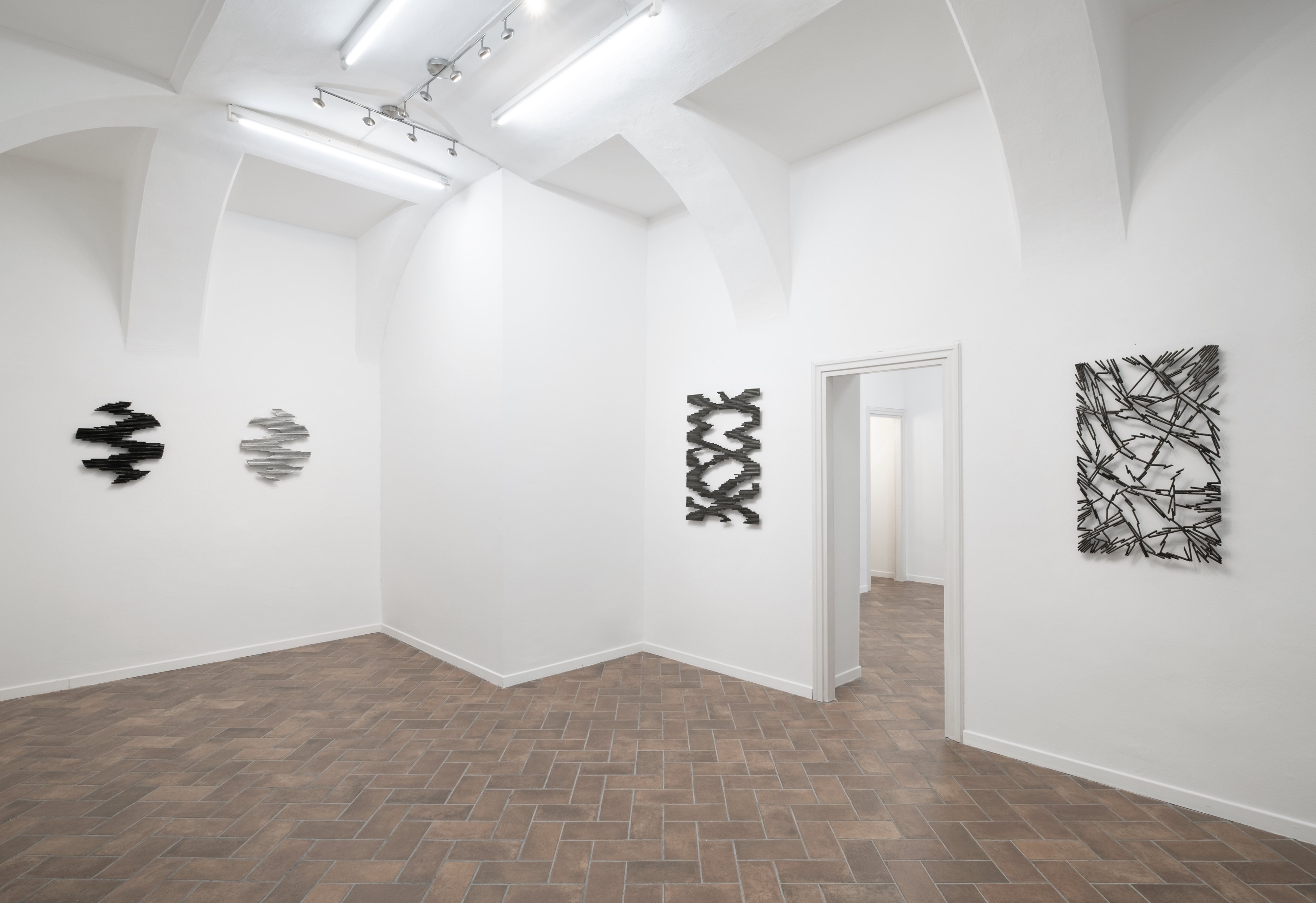 Lavoro che elegge il tondino di metallo, di acciaio, denso, pesante, da comporre in diverse strutture e pattern formali, alle quali l’artista sopraggiunge con precise e anche pericolose operazioni di assemblaggio e saldatura: un lavoro muscolare che dà esito, però, a delicatissimi, apparentemente anche fragili e leggere opere di metallo monocromo che l’artista libera sulle pareti, fa occhieggiare dai muri, chiedendo allo spettatore un percorso di avvicinamento all’opera che lo porta a scoprirne le trame misteriose e seducenti, i perfetti intrecci e le vibranti aperture, i saliscendi metallici e le tensioni materiche.