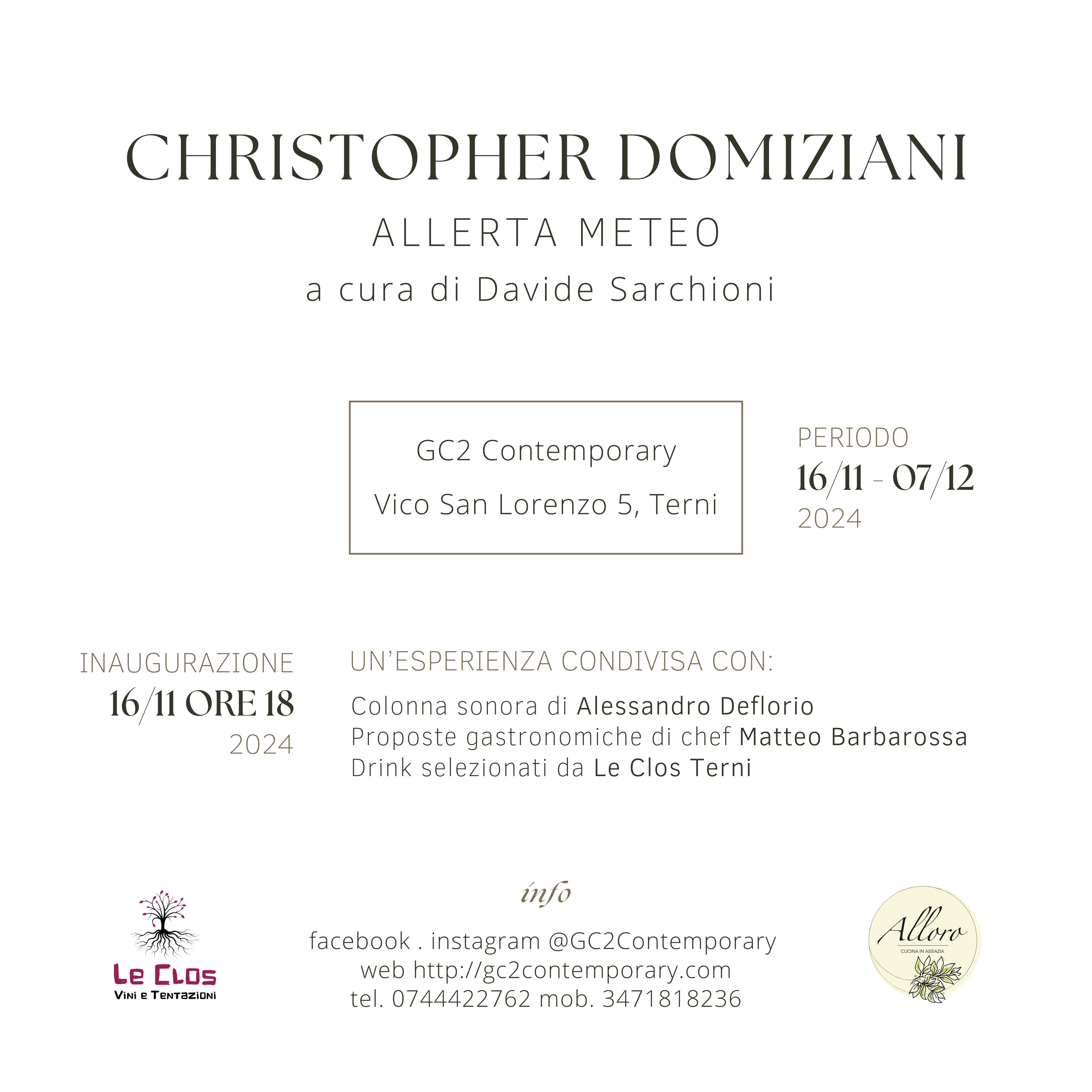 GC2 Contemporary è lieta di presentare la mostra personale di Christopher Domiziani, intitolata “ALLERTA METEO”, un progetto a cura di Davide Sarchioni.