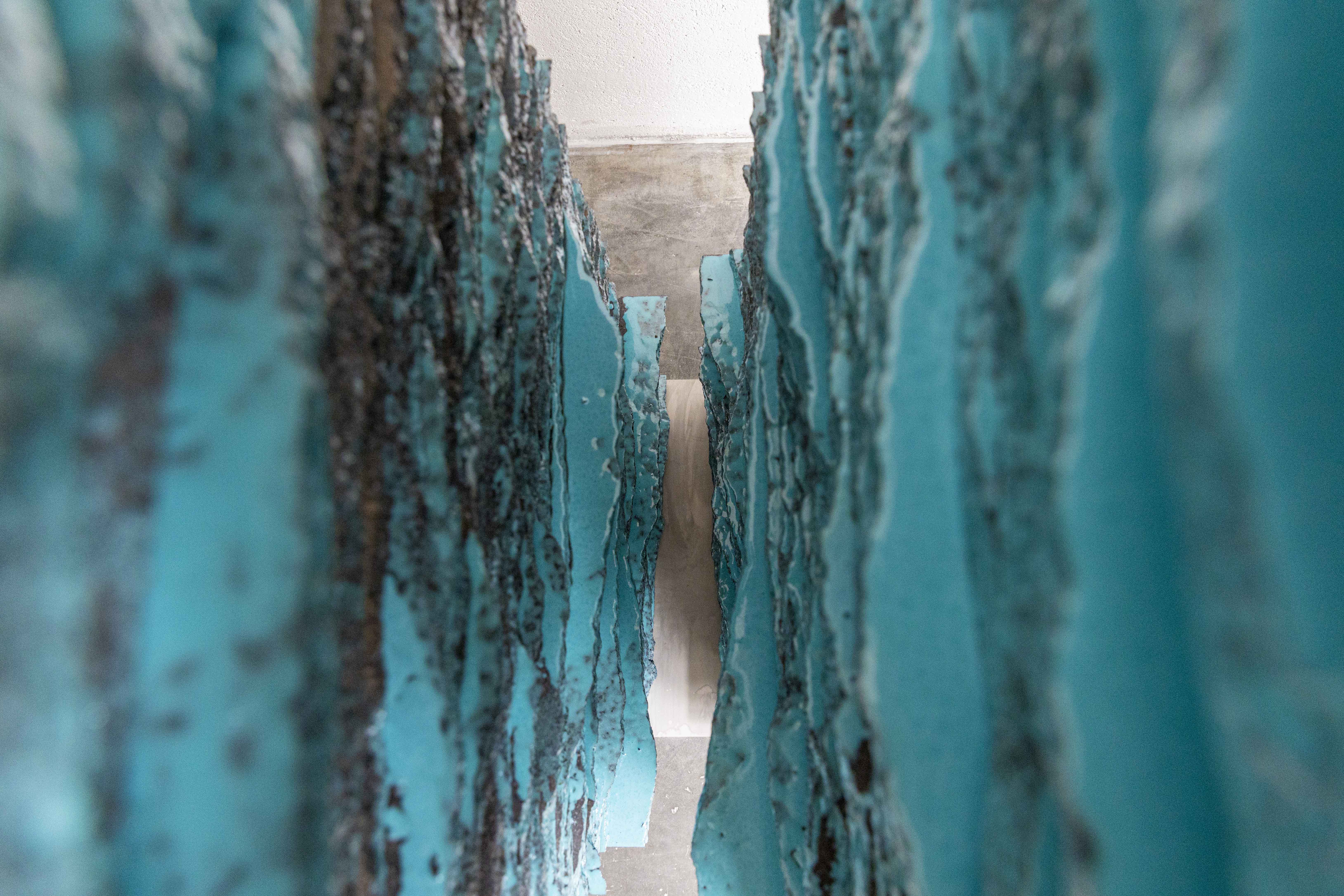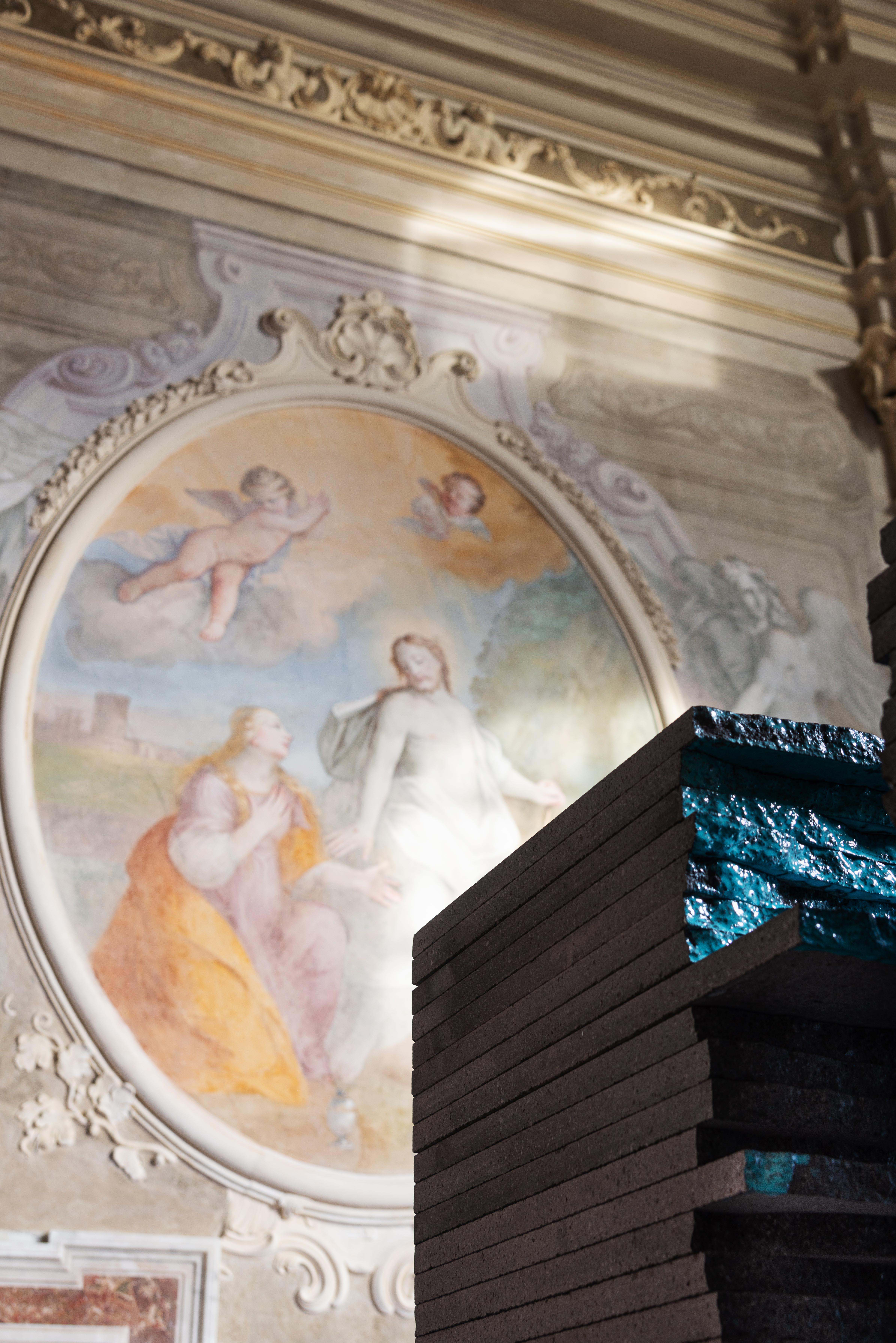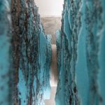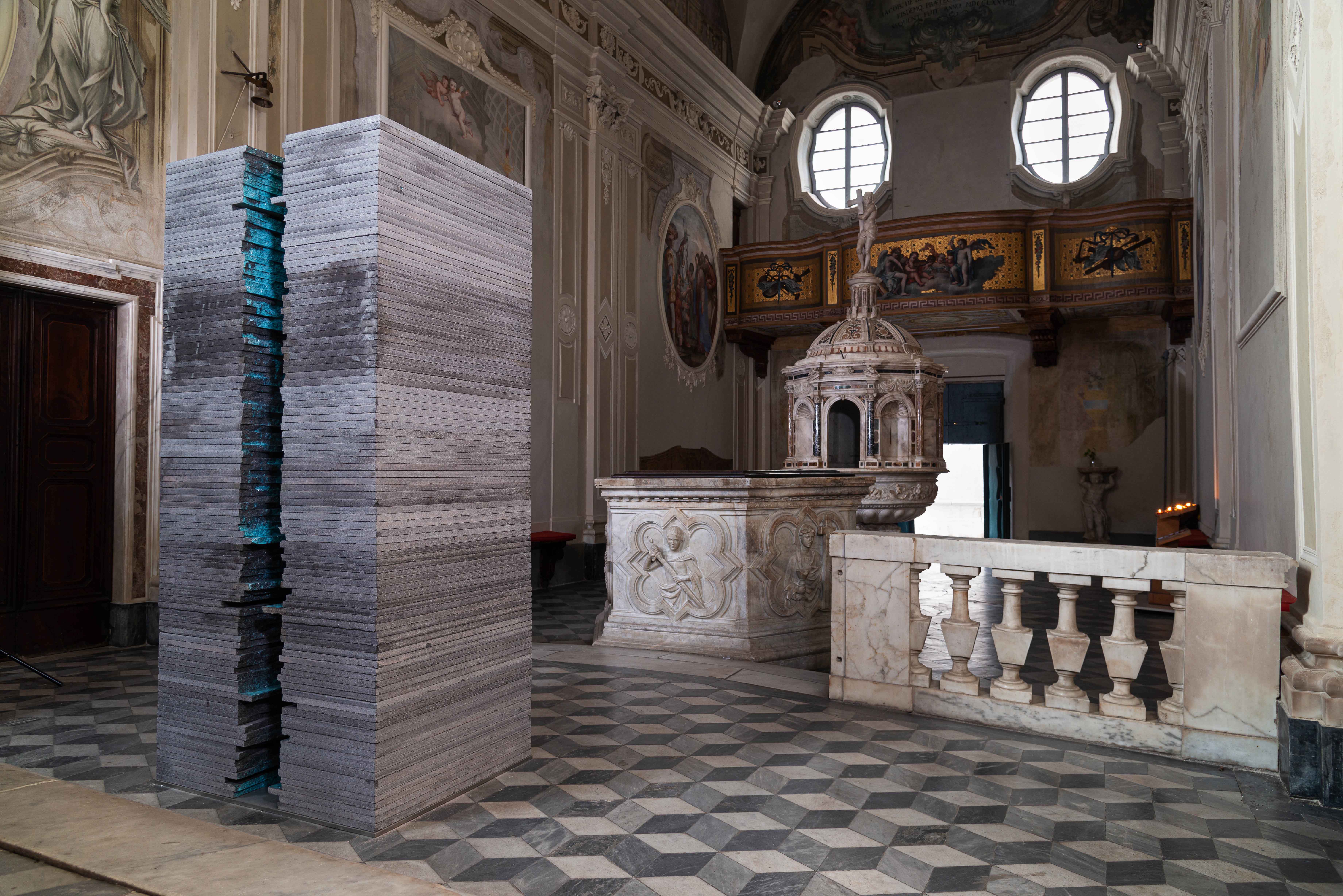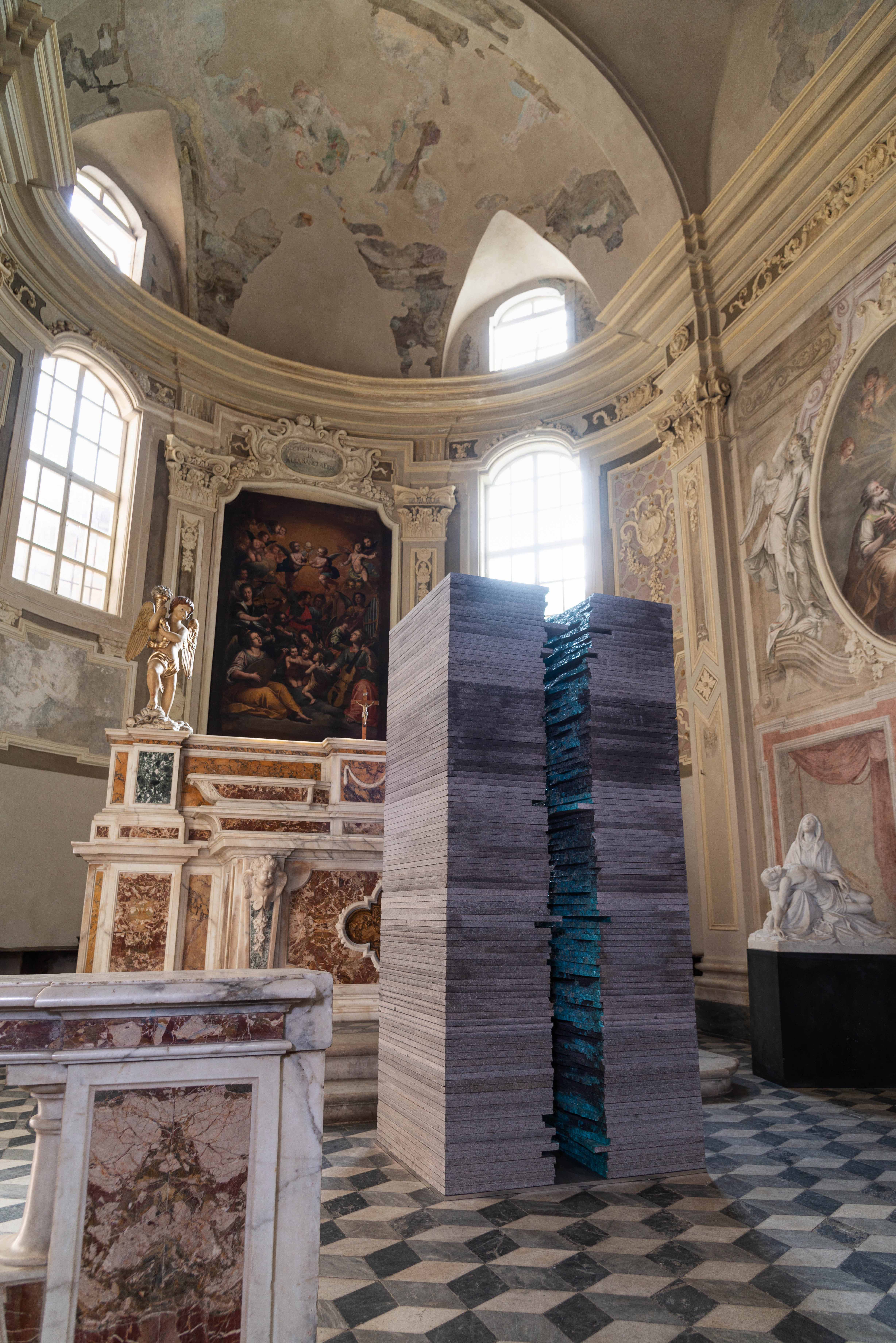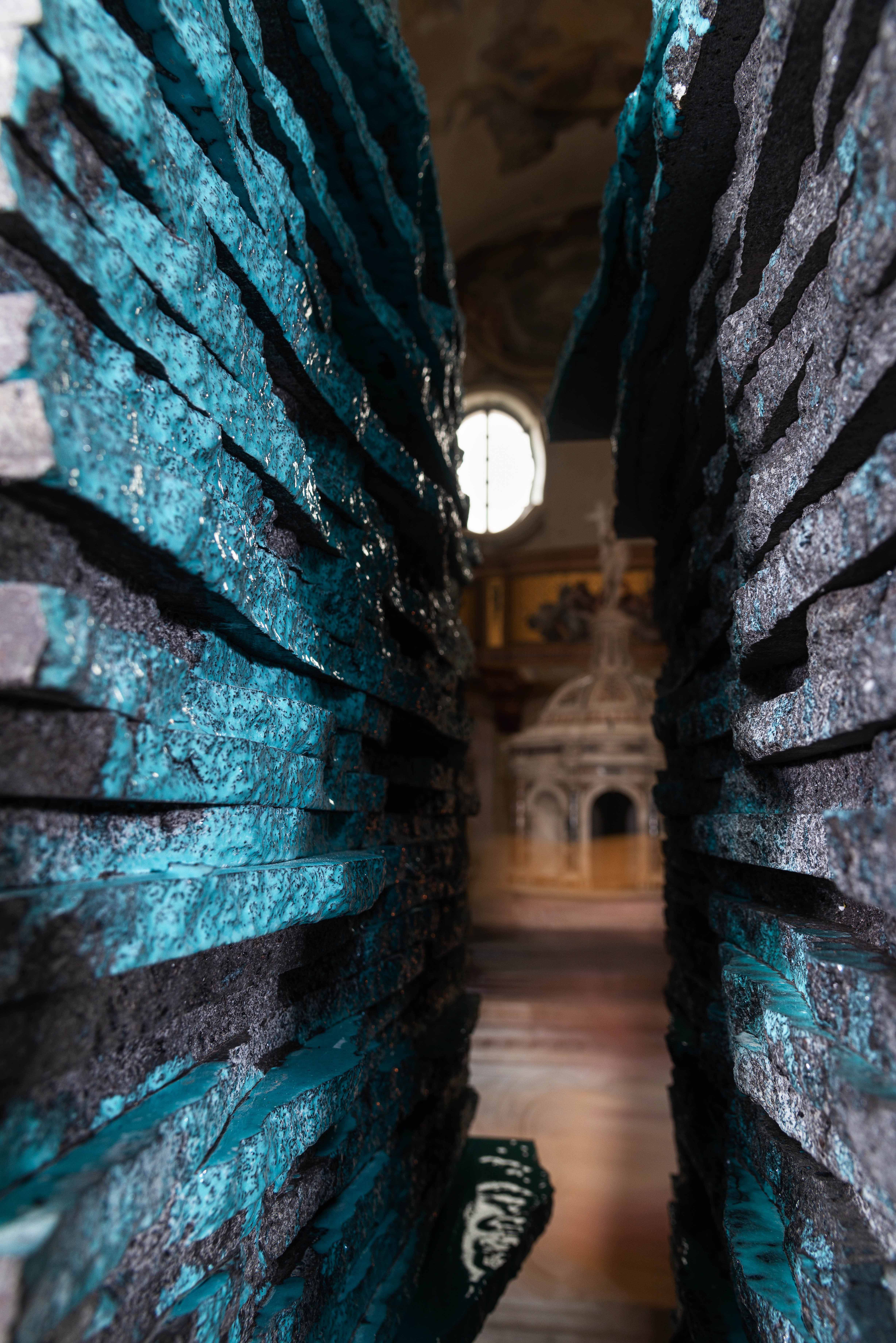 Con il progetto “Moses”, l’artista inserisce un valore evocativo al luogo di culto del Battistero del Duomo di Pietrasanta che a sua volta interagisce con l’opera realizzata, un enorme scultura in pietra lavica ceramizzata che si presenta come una sorta di monolite completamente spaccato al centro in senso verticale. L’immagine ci ricorda quello che accade in natura in un arco temporale di migliaia di anni, l’artista ci riporta alla mente gli scenari della formazione dei canyon ossia quando un fiume taglia rocce resistenti per formare una valle con pareti ripide e strapiombanti, in cui l’alternanza di strati orizzontali determina cenge e ripiani. Il colore della ceramica al suo interno raffigura la componente verticale dell’erosione fluviale che è nettamente predominante su tutte le altre attività di modellamento del corso d’acqua, fissa il tempo e lo spazio.