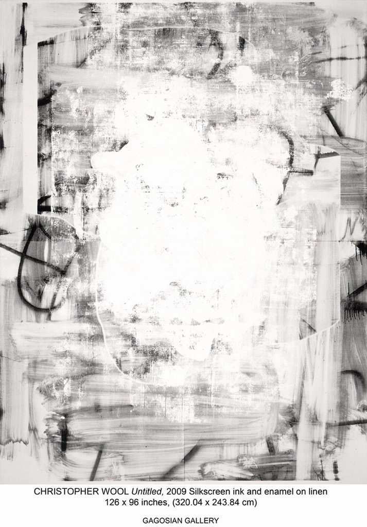 Wool filtra gli elementi della pittura astratta, quali la linea, la forma, e la superficie, attraverso la ruvida sintassi del degrado urbano, con un continuo controllo e rilascio gesturale. Sovrapponendo strati di varie tonalità di bianco ad elementi serigrafici usati in opere precendenti, (monocromi estratti da riproduzioni fotografiche, ingrandimenti di dettagli, e polaroid dei propri dipinti), l’artista condensa la superficie dei lavori “sovraccaricati” e al contempo li svuota apparentemente della propria sostanza. Rimangono solo fantasmi ad ostacolare il campo visivo, ciascuno sospeso nelle propria temporalità. Attraverso queste procedure di applicazione e cancellazione, Wool oscura le tracce indistinte degli elementi precedenti, usando così i concetti di riproduzione e negazione per inaugurare un nuovo capitolo della pittura contemporanea. Le sue opere sono quindi ugualmente caratterizzate da ciò che sono, e da ciò che non sono e che tengono nascosto.