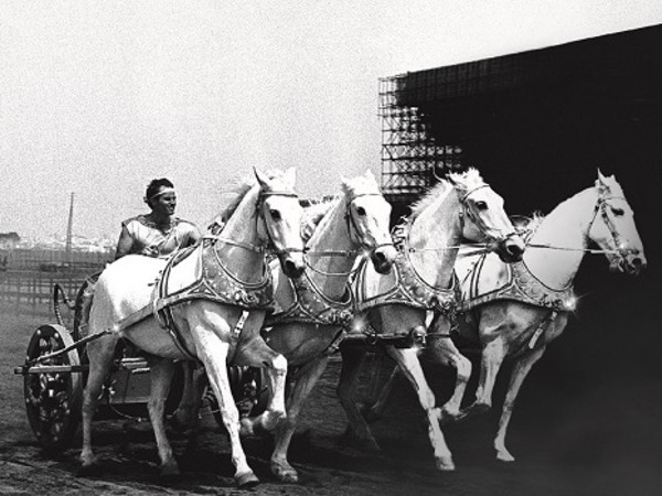 Gli anni Trenta sono così la posa della prima pietra (gennaio 1936) di Cinecittà, officiata da Mussolini: è la ‘Hollywood in camicia nera’ dei film dei telefoni bianchi, delle dive dell’autarchia come Assia Noris, Maria Denis, Clara Calamai, dei kolossal di un paese povero, del gigante Primo Carnera. Il sogno di un cinema che voleva imitare quello americano. La guerra poserà macerie su quel sogno, e porterà profughi e sfollati a vivere anche dentro Cinecittà. Ma sulle macerie nascerà il cinema inimitabile destinato a influenzare anche quello americano: Anna Magnani, Aldo Fabrizi, Roma città aperta, De Sica, Visconti. Sono le immagini del Neorealismo italiano. Un paese che fa la fame si riscatta con le diapositive delle maggiorate. Gina Lollobrigida, Sophia Loren, i campi di mondine accolgono la dirompenza della Mangano. L’immaginario italiano sta per esplodere, e non c’è foto che lo testimoni meglio di quella di Audrey Hepburn in lambretta gioente nelle sue Vacanze romane; accanto, quella di Charlton Heston ugualmente romano sulla biga di Ben Hur: è la nascita della ‘Hollywood sul Tevere’, l’arrivo dei divi e dei capitali statunitensi: Kirk Douglas, Ava Gardner, Liz Taylor, l’epica dei peplum (in via Tuscolana chiamati più familiarmente ‘sandaloni’). È l’Italia in 500, e di Cinecittà al centro del mondo, grazie a un’altra parola-chiave, il titolo di un film. La dolce vita. La foto di Federico Fellini ‘dentro’ la Fontana di Trevi con Anita Ekberg vale la mostra: c’è dentro un set, un’epoca, un sogno.