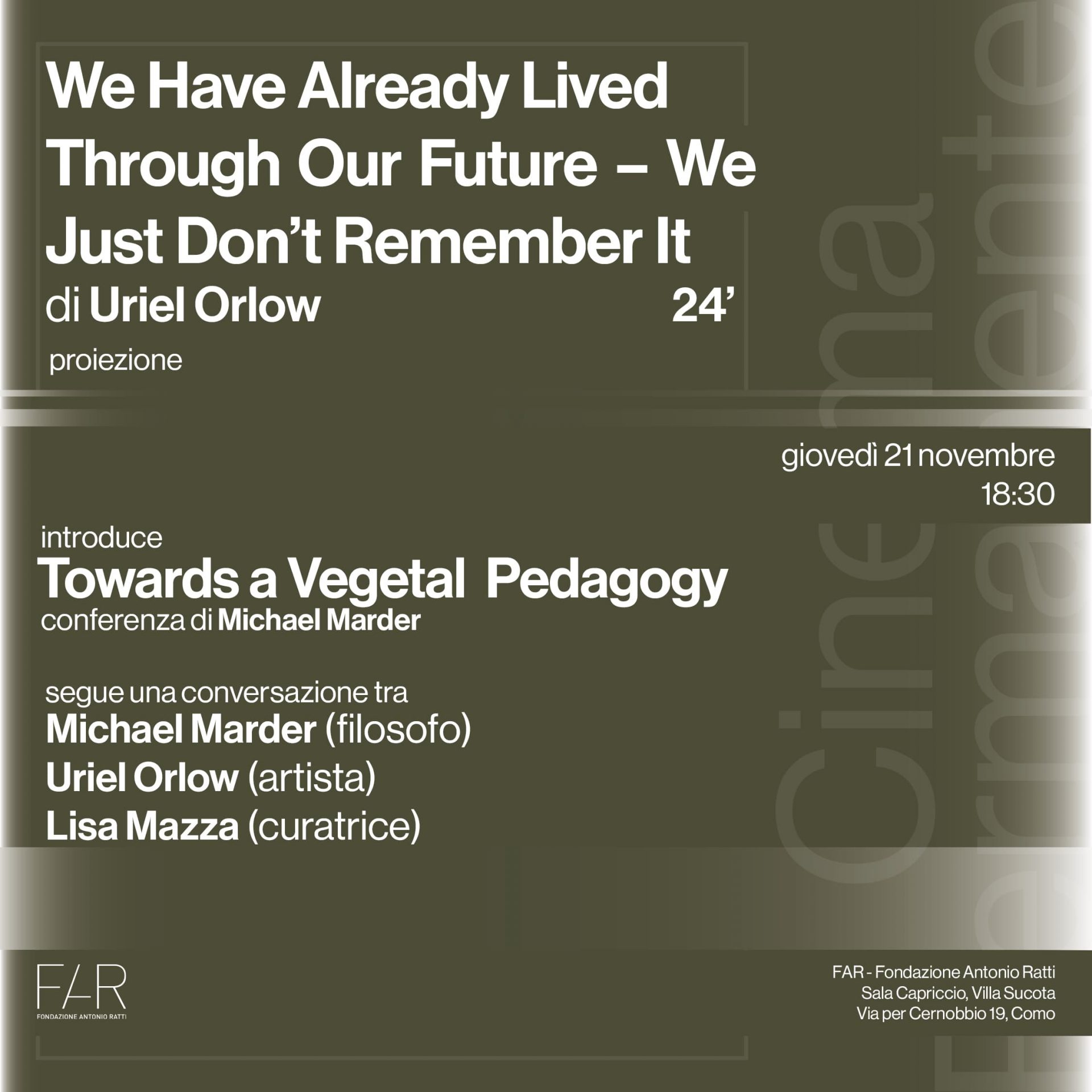 La Fondazione Antonio Ratti è lieta di invitarvi il prossimo giovedì 21 novembre a partire dalle 18:30 per il secondo appuntamento della rassegna Cinema Permanente, che include la presentazione e la proiezione di We Have Already Lived Through Our Future—We Just Don't Remember It (2024) di Uriel Orlow, introdotte dalla conferenza Towards a Vegetal Pedagogy di Michael Marder e seguito da una conversazione tra Michael Marder, Uriel Orlow e Lisa Mazza.