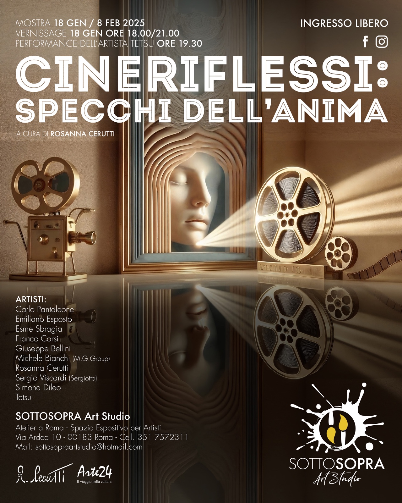La SottoSopra Art Studio è lieta di presentare “CineRiflessi: Specchi dell’Anima”, una mostra collettiva dedicata al rapporto tra cinema e arte visiva. L’evento, curato da Rosanna Cerutti, invita a esplorare il cinema come specchio delle emozioni, della cultura e della creatività .