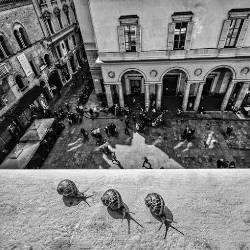 Con una esposizione personale all'interno del Circuito Off di Fotografia Europea, iniziativa internazionale che si tiene da ormai dieci anni a Reggio Emilia, Cinzia Bianchi, fotografa toscana con al suo attivo numerosi lavori attenti non solo all'estetica della fotografia, ma anche alla tematica ambientale, culturale e antropologica, propone quest'anno una mostra, curata da Stefania Ferrari, dal titolo Viaggio lento sulla SS9, che comprende una carrellata di opere in cui due chiocciole fanno da guida tra paesaggi e monumenti che costeggiano la via Emilia, accompagnando lungo un percorso insolito che si snoda tra storia e cultura, presentando vedute non convenzionali e poco conosciute. Con le sue immagini fotografiche, la Bianchi diviene biografa ufficiale delle due inconsuete viandanti, seguendole e immortalandole nelle tappe del loro viaggio, in cui si assaporano panorami da un diverso punto di vista, privilegiando la lentezza, l'osservazione, il particolare, tutto ciò che normalmente non è compreso nella velocità e nella fretta.