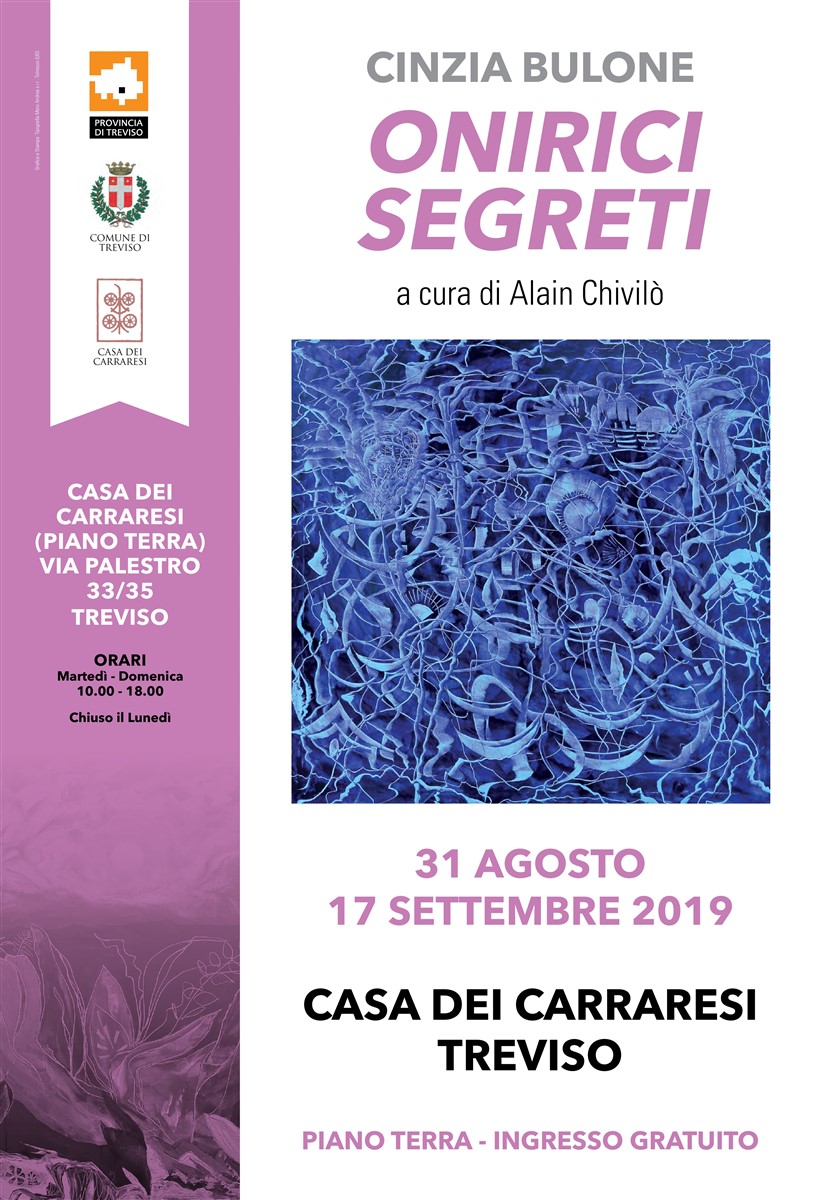 La prestigiosa sede espositiva di Casa dei Carraresi ospita, dal 31/8 al 17/9/2019, la personale Cinzia Bulone “Onirici Segreti” a cura del critico e curatore d’arte dr Alain Chivilò.