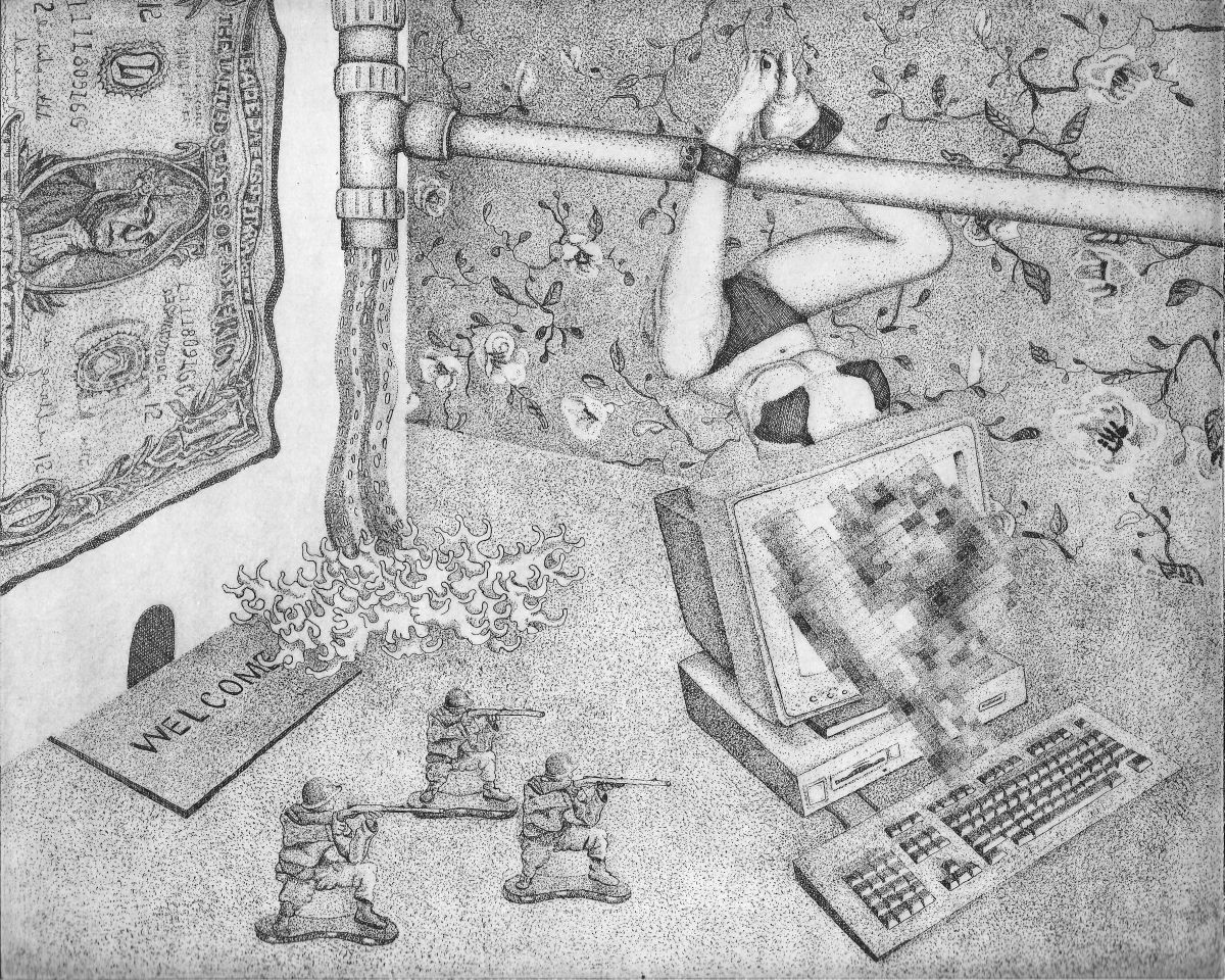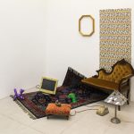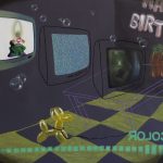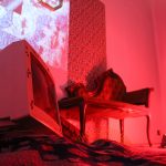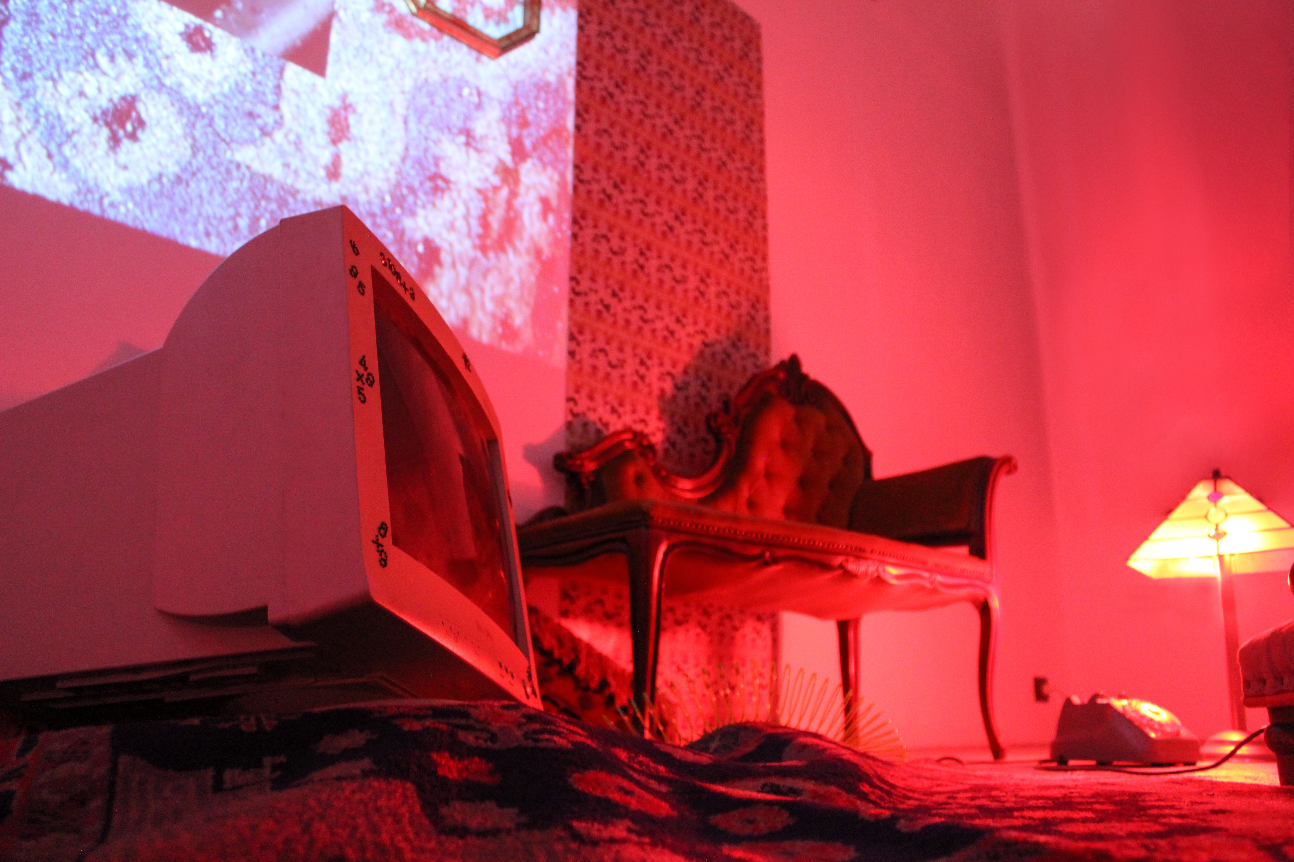 Un montaggio a bassa risoluzione in cui Cinzia mixa e scontorna elementi grafici e autobiografici, che viaggiano attraverso un intricato sistema di tubature idrauliche e tubi catodici, affiorando tra le cartelle del suo database in un nostalgico revival di interfacce bidimensionali ed effetti pixellati. Questo flusso trasborda i margini di una cornice vuota e invade l’angolo morto della parete di fondo, dove si intravede uno stralcio di carta da parati da bambino che regge la sezione di una stanza arredata. I primi elementi riconoscibili sono una chaise long rococò e un pesante tappetto persiano su cui sono impropriamente disseminati degli oggetti vintage pop.