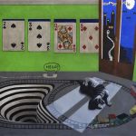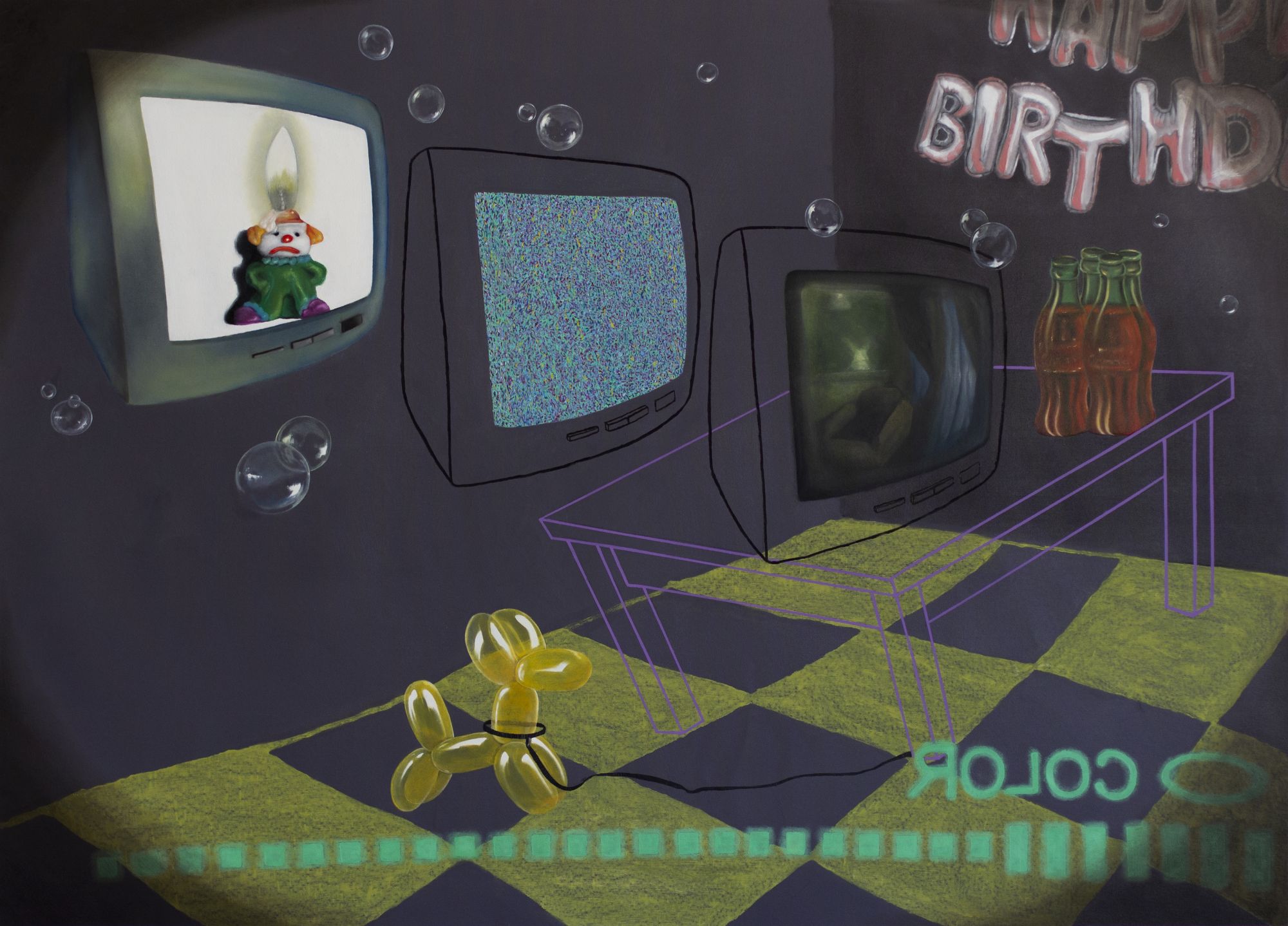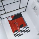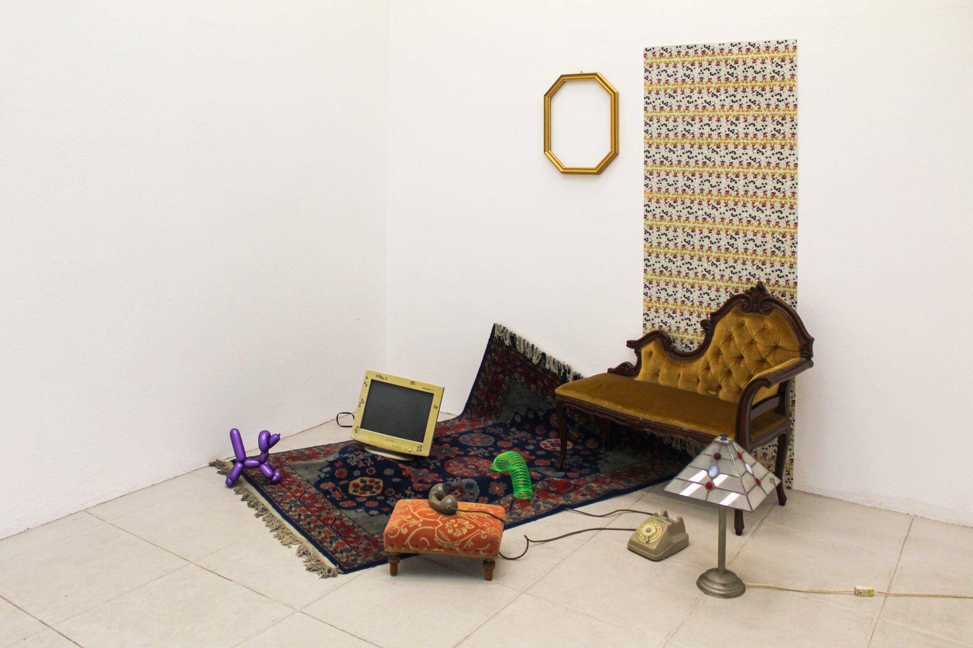 Il monitor di un vecchio pc, un piccolo gonfiabile omaggio a baloon dog di Jeff Koons, una molla di plastica fluo, una lampada da tavolo liberty accesa e un vecchio telefono bigrigio con la cornetta staccata. Tracce evidenti di una presenza. Una densità di presenze. C’è un senso di permanenza che pervade l’ambiente nonostante l’evidente assenza di persone. Una “sospensione di trama” in cui gli oggetti che coabitano il pavimento di questo improbabile salottino da gioco, raccontano una moltitudine di emozioni dissonanti.