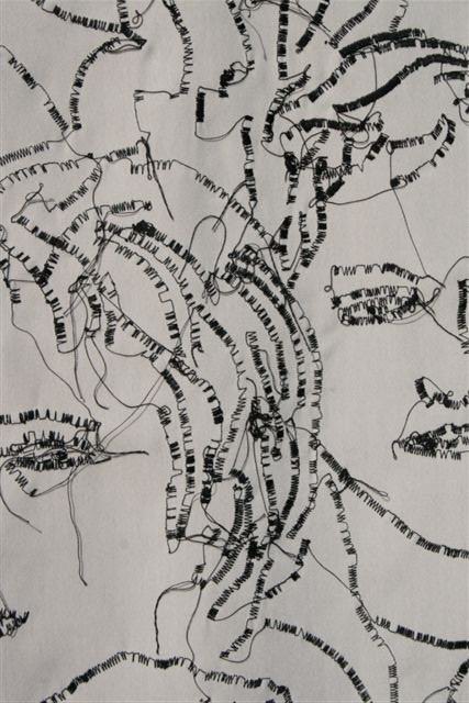 Tra bianco-nero e colore, ordine e disordine; tra rigido e morbido, tra negativo e positivo,… le opere di Sabina Romanin esprimono una ricerca continua di senso. I suoi lavori inseguono e producono un filo ininterrotto, impunturato, spiraleggiante, zigzagante nello spazio; un segno che riformula l’utopia del viaggio della vita in cui il farsi processuale coniuga le emozioni e i desideri con il pensiero cognitivo ed estetico. Il divenire non subordina il valore spaziale e formale ai contenuti ma domina attraverso la composizione minimale e la scelta dei colori base, inalterati in ogni singolo lavoro: il rosso dei lineamenti e delle labbra, il nero dei profili e dei corpi, il blu degli orizzonti.