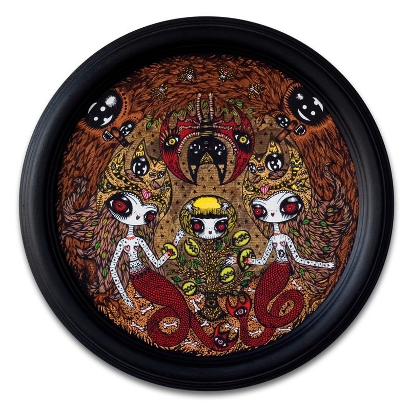 Sospesi tra il sogno e l’incubo, i suoi quadri sono caratterizzati da un fondo composto da un collage di vecchie carte su cui l’artista interviene con l’acrilico e l’inchiostro attraverso una tecnica che ricorda quella tipica del tatuaggio tradizionale.