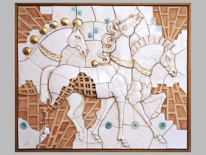 “Le due installazioni di Claudio Cottiga, la Sfera, già al Museo Civico Archeologico del Procoio di Borgo Sabotino per la rassegna estiva 2012 di MADArte (Latina) e lo straordinario gruppo equestre in terracotta policroma esposti, prima l’una e poi l’altro, nel corso di questo autunno, l’una in giardino, l’altro negli spazi interni della Raccolta Manzù, parlano di uno dei protagonisti più significativi e, credo, più amati, dell’attuale “Scuola Pontina”, vale a dire quel manipolo di artisti contemporanei, di eterogenea provenienza formazione ed età, che, per lo più per merito del promoter loci Fabio D’Achille, vado scoprendo, tra Pomezia, Aprilia, Sabaudia , essere folta attiva creativa e coinvolgente. “Manzù, l’Arte e il Territorio” del resto non è altro che una delle possibili interpretazioni desumibili dalla “legge quadro” indicata dallo stesso scultore bergamasco che, nel lascito testamentale con cui lasciava la Raccolta all’Italia e più in particolare alla Galleria nazionale d’arte moderna, indicava come priorità del museo ardeatino di porsi quale centro attivo di cultura e ricerca, anche territoriale. E’ quindi in quest’ottica l’intento, fortunatamente raccolto da realtà espositive ufficiali e da singoli “amatori e cultori” del territorio, di fornire brevi panoramiche “a volo radente” di singoli episodi del contemporaneo “indigeno” di particolare spessore ed interesse, come appare qui oggi la presenza dello scultore Claudio Cottiga, proveniente dalla limitrofa Aprilia, dove in passato ha significativamente contribuito alla realizzazione delle porte bronzee della chiesa cattedrale, antistante il San Michele Arcangelo di Venanzo Crocetti. “Scultura del novecento” e “territorio” sono dunque due temi che in Raccolta si fondono e s’interfacciano anche in questa occasione. Terzo e più importante tema, è, sempre qui oggi, costituito dal “caldo colore” della terracotta policroma di Cottiga, che accosta tasselli cromatici dalla raffinatezza “Art Nouveau”, intervallando moderate dorature musive, ad un’argilla rossa che sa di vivo, strigilata, pettinata in onde euritmiche che, mi si perdoni, sembrano quelle di certe costosissime uova di Pasqua di alta pasticceria napoletana di marca Gay Odin… Ne deriva una materia nuova, accattivante, cangiante al variare della luce, che invita a rimeditare per sommi capi le vicende appartenenti alla nobilissima arte italiana di ceramiche e maioliche, partendo dai Della Robbia, per arrivare ad assoluti protagonisti del ventesimo secolo, da Leoncillo, a Fontana, ad Agenore Fabbri, indistintamente catturati dal pittoricismo e dalle infinite possibilità espressive di questa affascinante tecnica, per non parlare dell’eccellenza altrettanto italica di centri di altissima produzione artigianale, come Umbertide o Faenza…