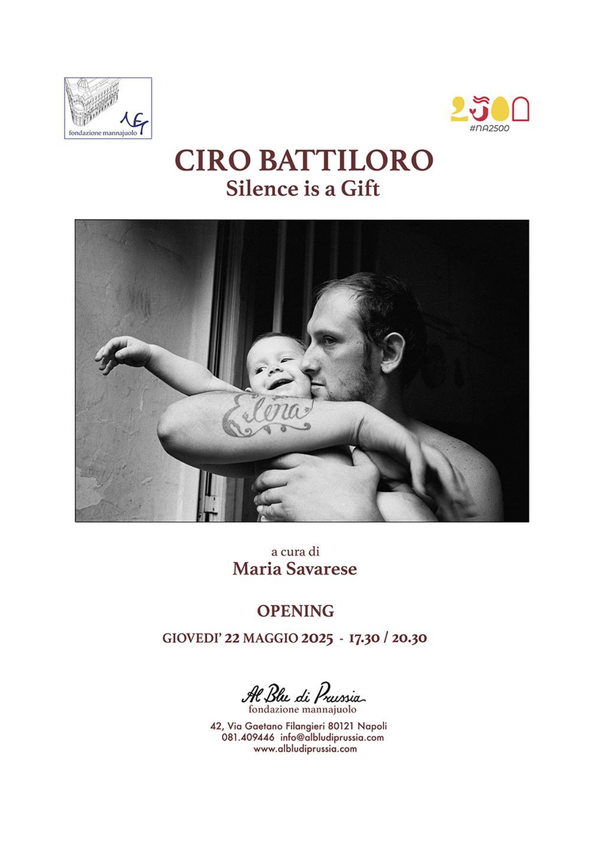 Da giovedì 22 maggio 2025, la galleria ospita “Silence is a Gift” di Ciro Battiloro, a cura di Maria Savarese. In mostra foto dai progetti “Sanità”, “Santa Lucia” (2015-2021) e “Le Petit Souffle”. Apertura: 17.30–20.30, nell’ambito delle celebrazioni Napoli 2500.