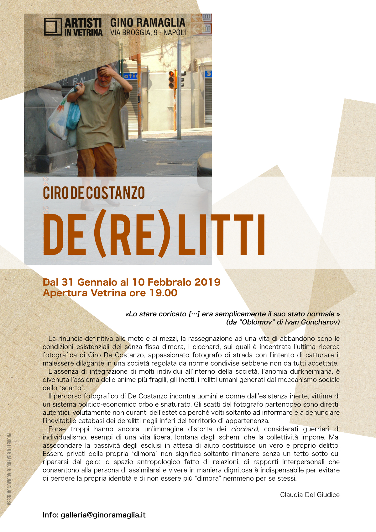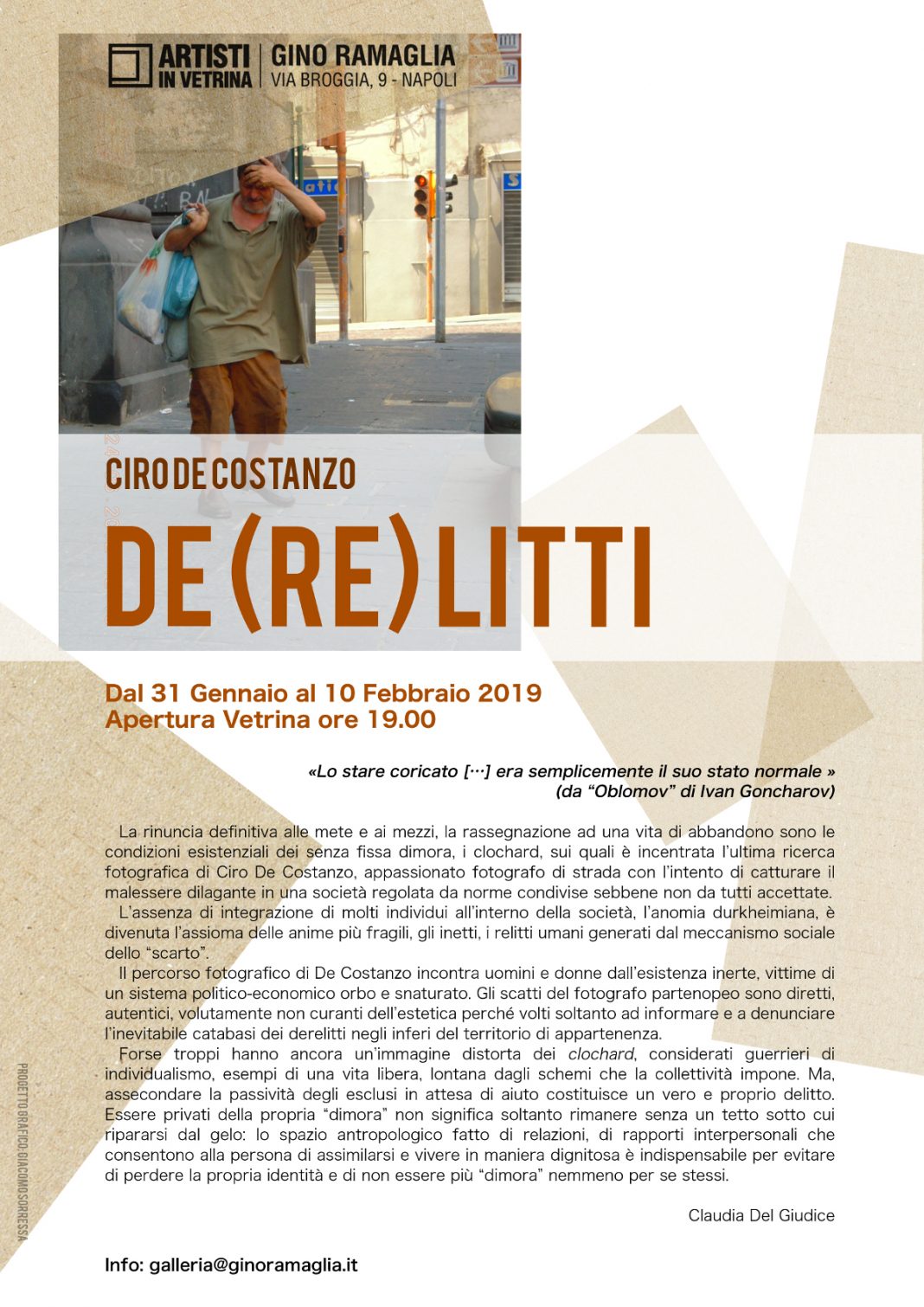 La rinuncia definitiva alle mete e ai mezzi, la rassegnazione ad una vita di abbandono sono le condizioni esistenziali dei senza fissa dimora, i clochard, sui quali è incentrata l’ultima ricerca fotografica di Ciro De Costanzo, appassionato fotografo di strada con l’intento di catturare il malessere dilagante in una società regolata da norme condivise sebbene non da tutti accettate.