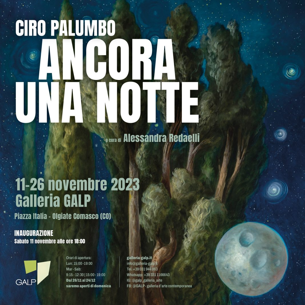 Ancora una notte è la prima personale ospitata nella nuova sede della Galleria d’arte contemporanea GALP, in Piazza Italia a Olgiate Comasco; mostra rivelatasi una chiave di svolta nel percorso artistico di Ciro Palumbo, nel quale lui stesso ha dichiarato di essersi riscoperto e messo in gioco.