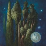 Anche se non mancano i soggetti cari all’artista quali le barche occhiute, le isole fluttuanti, le stanze metafisiche, gli animali – tra cui uno splendente toro dalla coda in fiamme – sono gli alberi i protagonisti della mostra. Quando si scosta lo sguardo dall’innegabile fascinazione del soggetto, dietro, intorno, si scorgono paesaggi pieni di materia pittorica che si rivelano tutt’altro che sfondi. Mi azzarderei a dire che il pezzo di cuore che batte, si trovi proprio lì. Nella materia inquieta, densa di pennellate ocra, che si fa cielo subito prima del temporale; nello spazio convulso, abitato da edifici in fiamme, alle spalle della solitaria B52; nell’oro fiammeggiante su cui si stagliano gli alberi danzanti, definiti da un segno netto di contorno – raro in Palumbo e per questo così prezioso.