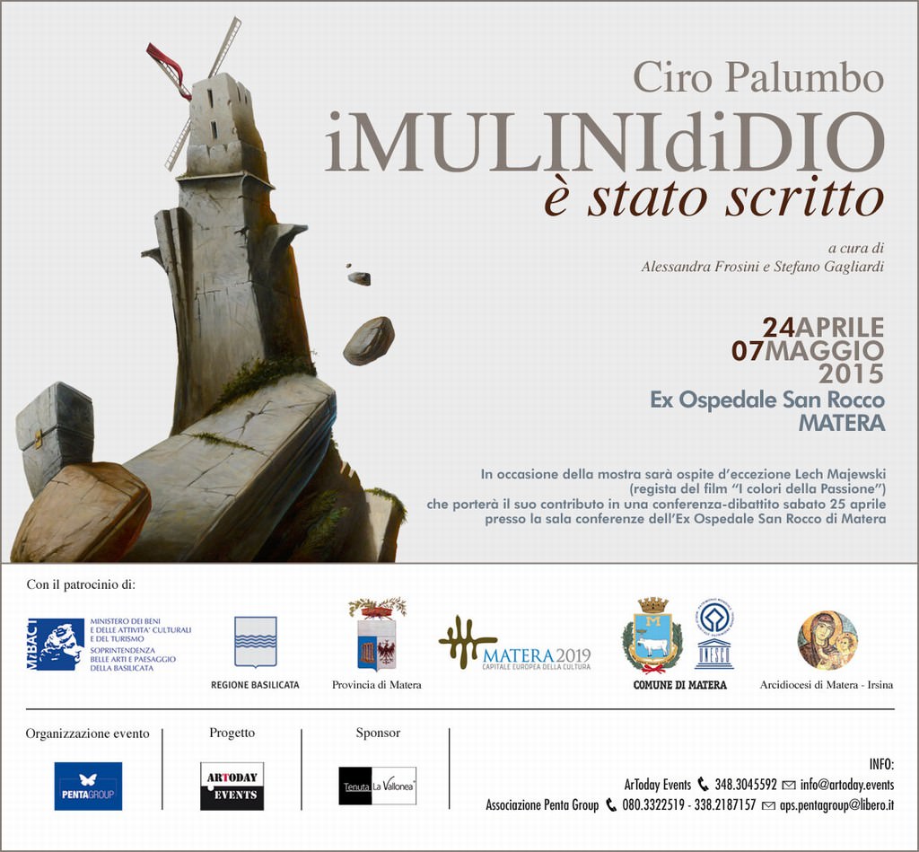 Da questa suggestione nasce in Palumbo il desiderio di approfondire lo studio della poetica del pittore cinquecentesco e da questo punto di partenza nasce la serie di opere “i MULINI di DIO”, una sua personale visione filosofica della parabola umana che, come una ruota, gira e si ripete nel tempo. Cambiano i soggetti, cambiano i tempi, ma la storia umana pretende, sempre e comunque, il sacrificio di un capro espiatorio per peccati che reputa non suoi. Tutto questo sembra avere origine da una fede spesso non risolta e in perenne conflitto con le ragioni del cuore e gli inganni della mente. Ciro Palumbo fa proprio questo dramma e ricompone le tavole come in una Via Crucis dove la ricerca di un’armonia con il Divino, inesorabilmente si scontra con il cedimento dell’animo umano di fronte al dolore e al mistero della morte. L’artista, mentre è consapevole dell’inesorabilità ciclica di questo dramma umano, indica per se stesso e per noi, il percorso e la speranza di una possibile salvezza. La Mostra “i MULINI di DIO”, presentata a Nola (NA) nell’ottobre del 2014, prosegue il suo viaggio nella città di Matera per approdare poi a Firenze. In ciascuna di queste sedi l’occasione di una più approfondita riflessione del viaggio pittorico già intrapreso con l’aggiunta di nove opere a olio, sia su carta che su tela.