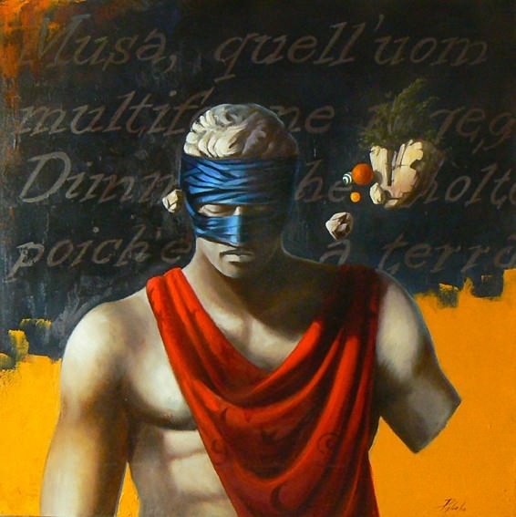 Negli ultimi lavori vediamo emergere un'interessante simbiosi tra pittura e scrittura, che si esprime sia concettualmente, attraverso la scelta di simboli cromatici, figurativi e allegorici, sia tecnicamente, attraverso l'uso di collage sulla tela di pagine di libri antichi (testi omerici) e di particolari trattamenti del colore.