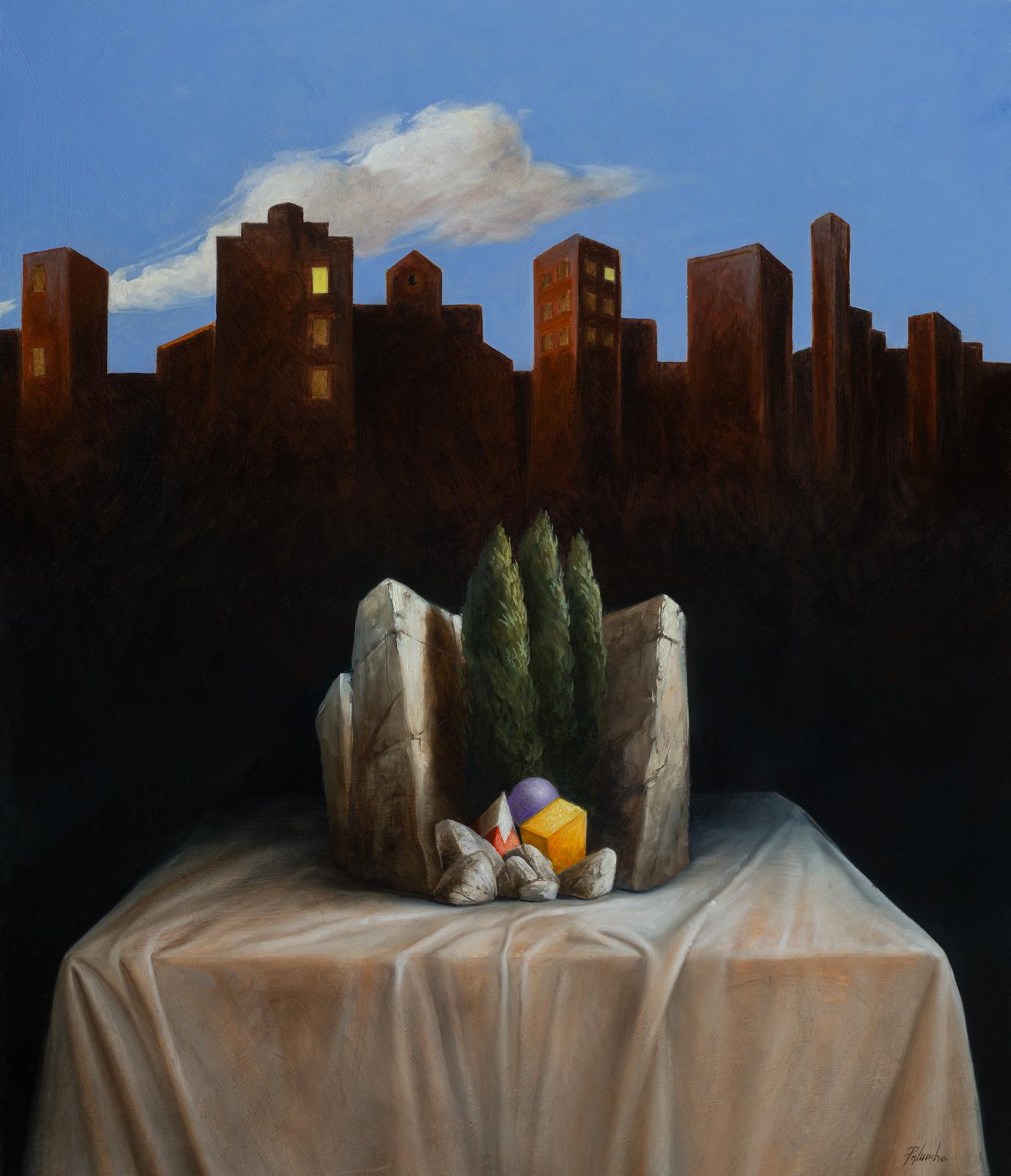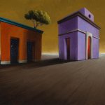 In questa nuova mostra Palumbo ci propone una serie di circa 20 opere dedicate alle città e alle periferie a confronto con due opere di Mario Sironi. Le città di Palumbo sono città silenti, rigide, spigolose, dove la luce è timida e artificiale. L’artista sente il bisogno di rifugiarsi nelle ombrose inquietudini, le sue vedute sono luoghi da dove è possibile spiccare il volo per un luogo dove fermarsi sospesi. I paesaggi urbani di Sironi, pur essendo definiti “metafisici” hanno già insite le caratteristiche del suo ritorno all’ordine “classicista”. Le linee rette, case, poligoni perfetti in spazi perfettamente equilibrati, richiamanti un classicismo enigmatico, ricco di presentimenti, ripropongono la monumentalità della desolazione delle periferie e il doloroso senso d’isolamento.