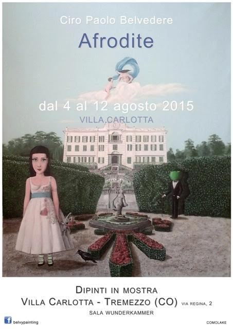 Afrodite, che da il titolo anche alla mostra, è l’ultima produzione dell’artista. Opera dedicata a questa stupenda Villa che ospita, tra le altre, la celebre scultura di Antonio Canova; Amore e Psiche. Afrodite, Amore e Psiche, i protagonisti della storia narrata da Apuleio, nella sua opera Le Metamorfosi, impressi sulla tela in una sua magica visione tra i giardini di Villa Carlotta.