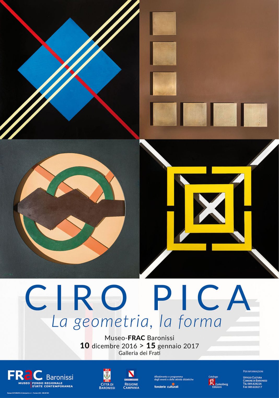 Sabato 10 dicembre ore 18:30, nel salone delle conferenze del Museo-FRaC di Baronisssi, il sindaco dott. Gianfranco Valiante e il direttore del FRaC prof. Massimo Bignardi, inaugurano la mostra retrospettiva CIRO PICA la geometria, la forma, realizzata grazie al sostegno della Regione Campania, Assessorato alla Cultura.