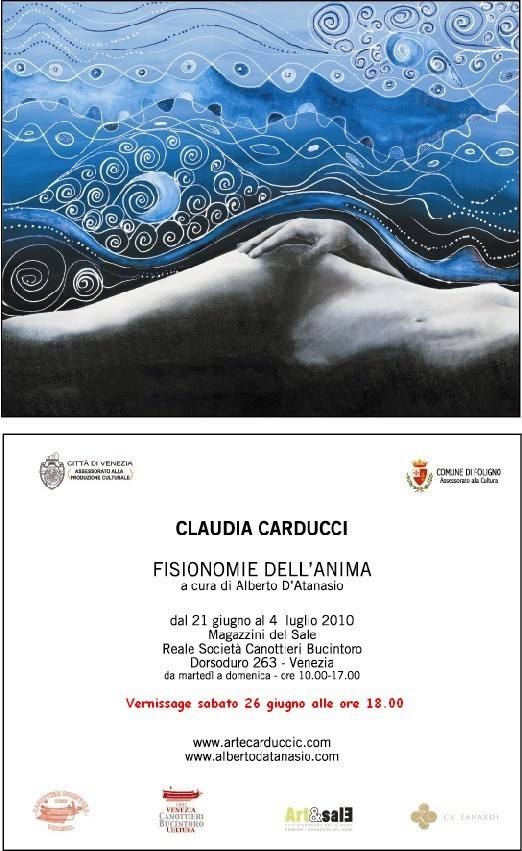 RSC Bucintoro e Bucintoro Cultura nell'ambito del progetto Art&salE hanno il piacere di invitare la SV sabato 26 giugno alle ore 18.00 al vernissage "FISIONOMIE DELL'ANIMA" di Claudia Carducci, a cura del prof. Alberto D'Atanasio, presso i Magazzini del Sale, Dorsoduro 263 - Venezia. La mostra rimarrà aperta al pubblico da martedì 22 giugno a domenica 4 luglio 2010, dalle ore 10.00 alle 17.00.