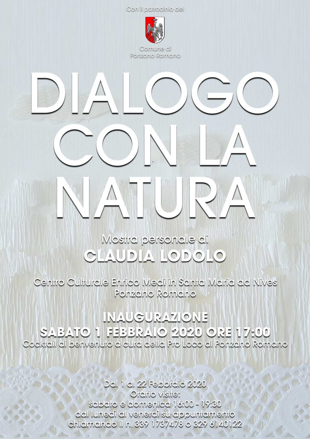Mostra personale di Claudia Lodolo. Sedici lavori in mostra che invitano a dialogare con Madre Natura. Cocktail di benvenuto offerto dalla Pro Loco di Ponzano Romano.