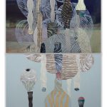 Dittici, trittici e polittici: i collage, come scrive Chiara Cardini nel testo critico, “sono mondi dai nomi inusuali come Calici, Lamelle, Peduncoli, Stigmi, Infiorescenze, poiché derivano da ricerche intorno a materie vegetali e animali, da disegni scientifici, fotografie al microscopio, ma anche da trame e decorazioni astratte.”