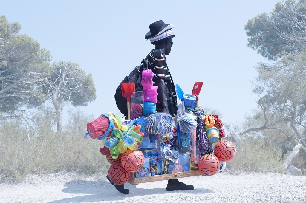 “Camminano. Vanno di qua e di là, indaffarati, assorti in chissà quali pensieri, inseguendo chissà quali sogni, chini sotto il peso della mercanzia esibita come un trofeo o indossata come un cilicio, messaggeri della sottomarca. Il paesaggio dietro di loro è sempre lo stesso, definito in orizzontale da tamerici incolti e chiuso ai lati da due quinte formate da sparuti pini marittimi. È dipinto o è vero? Se fosse un fondale dipinto, le persone in primo piano sarebbero attori o comparse. Ma nel caso di una scena reale, di un paesaggio vero, si tratterebbe invece di ritratti? Di ritratti in posa, quindi? O si tratta invece di immagini di strada e dunque di fotografia istantanea? Ma allora perché il paesaggio che si staglia dietro a questi viandanti è così chiaro, quasi scolorito? Strana faccenda.