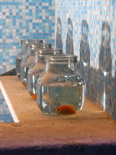 Un microambiente che viene occupato, in modo contraddittorio, con una serie di pesci rossi: otto pesci per otto bocce di vetro poste in ordine sulle due mensole che sorreggevano le cassette dei pesci, morti, da vendere.