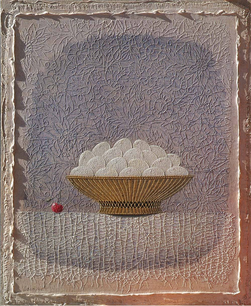 La leggerezza del segno e i toni delicati danno forma ad insolite nature morte e improbabili paesaggi dai richiami vagamente fiabeschi.