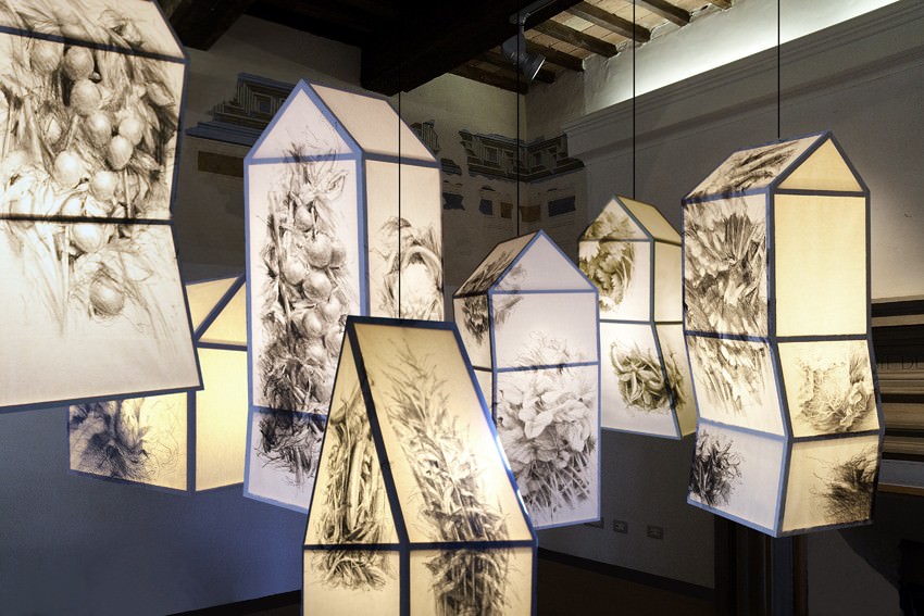 Ecco però apparire delle casette, un incrocio tra lanterne magiche e case di bambola le cui pareti sono costellate di disegni di insalate, come forme plastiche reiterate, costellazioni di figure che conferiscono anche all’insalata come agli alberi e ai fiori una loro dignità estetica portatrice di un messaggio profondo, il segno di un’apertura dove il nuovo è proprio quello che abbiamo sotto gli occhi magari senza vederlo, o vedendolo di nuovo e meglio, come la casa che non è solo un abitazione ma il luogo in cui vivere.