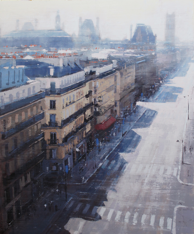 Il tema dell’esposizione, infatti, è quello caro all’artista: le grandi città. Cionini, che dipinge ad acrilico utilizzando una spatola e quasi graffiando la tela, ce le presenta come un libro con le pagine sollevate, e aperte, su di un racconto che appare infinito. E forse proprio per questa ragione, perché il racconto non finisce, le sue città non possiedono un orizzonte definito, ma la ‘narrazione’ converge verso un punto indefinito, visto da posizione elevata, verso cui convergono le linee ideali della composizione. Lo spazio si dilata, i colori sono l’ocra, il grigio, il celeste e il rosso, al solito, la presenza umana al più è accennata sebbene la si avverta: alla guida delle auto che percorrano le Avenue nella “Grande Mela” o i Boulevard parigini, dietro le facciate dei palazzi di uffici e le vetrine dei bistrot, nelle viscere delle città dove scorre il metrò. Senza una presenza umana ben definita, lo spettatore è indotto a concentrarsi sui dettagli della città e così a cogliere, di ciascuna, la personalità e l’energia che custodisce.