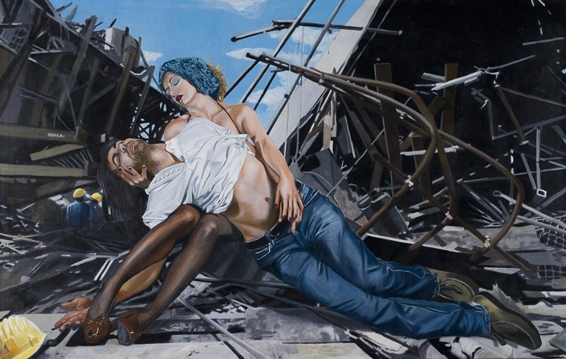 Claudio di Carlo ancora una volta costruisce la sua pittura partendo da un fatto di cronaca o meglio da immagini prese dalla cronaca. Claudio carpisce la configurazione delle forme: uomini e donne che riempiono le strade, affollandosi attorno a degli striscioni. Sono scatti fotografici di manifestazioni di anni diversi e di luoghi diversi; viene evocata una dimensione internazionale, planetaria. (…) “Era di Maggio” non è un’indicazione cronologica: è il segno di uno stato d’animo, della speranza, che maggio torni come Persefone dall’Ade a liberare le energie in grado di ripensare e rifondare una società che nella folle corsa con cui insegue il mito di se stessa, della sua potenza, della sua perfezione, lascia una lunga scia di vittime di cui non ci resta neanche più il tempo di avere pietà.